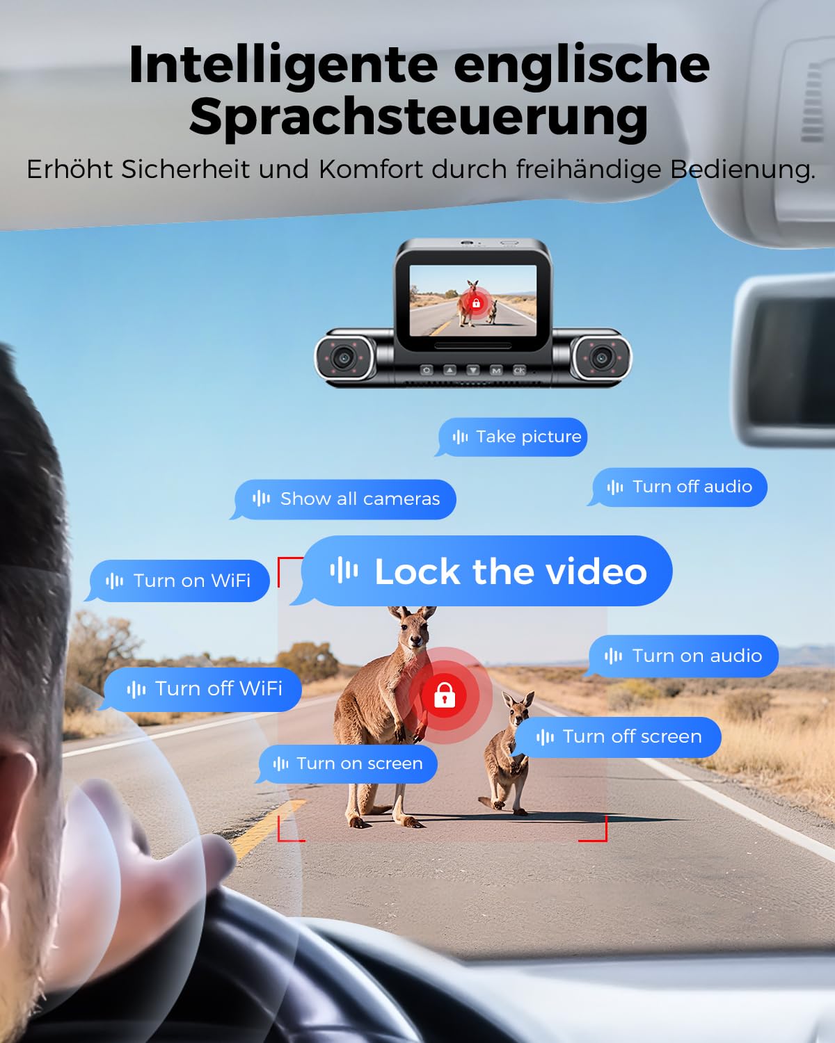 Die Dashcam verfügt über mehrere smarte Funktionen. Mit der Sprachsteuerung können Sie wichtige Befehle wie 'Aufnahme sperren' oder 'Foto machen' geben, ohne die Hände vom Lenkrad zu nehmen. Dank 5G WiFi übertragen Sie Aufnahmen bis zu viermal schneller auf Ihr Smartphone. Zudem zeichnet das integrierte GPS Ihre genaue Route, Geschwindigkeit und Position auf, was im Schadensfall als wichtiger Beweis dient.