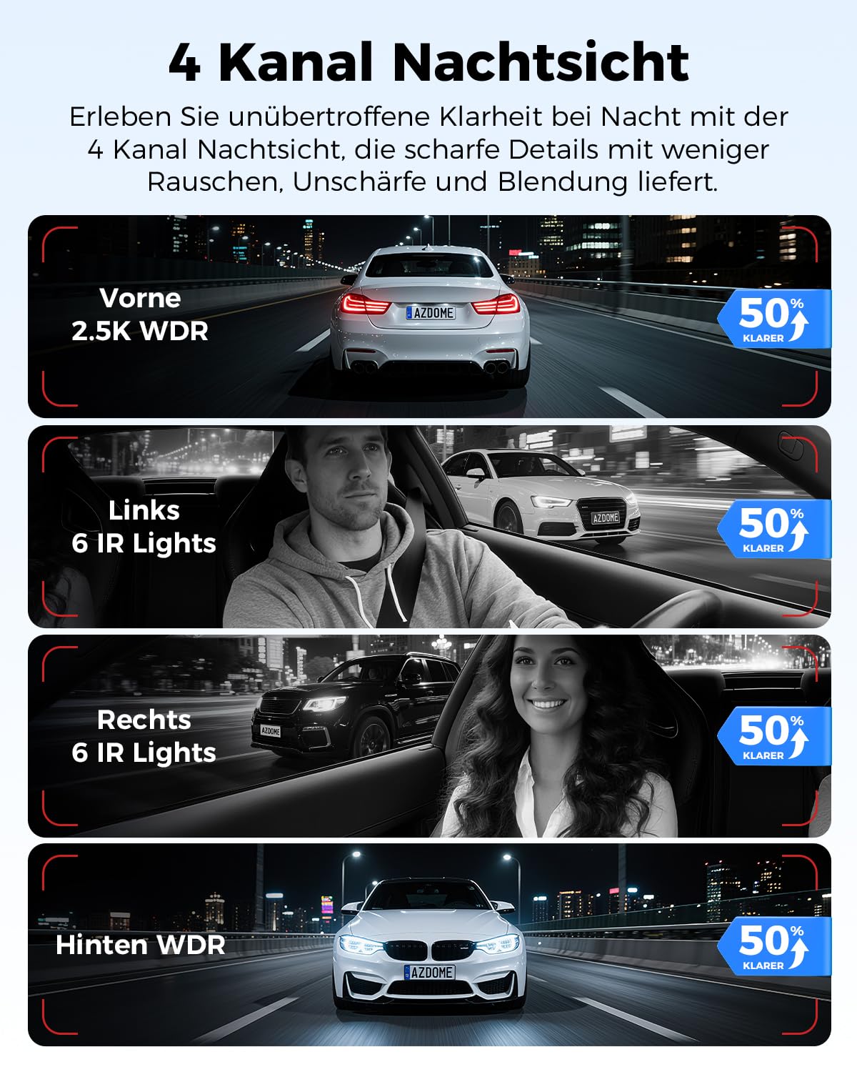 - 4-Kanal-Aufzeichnung: Eine 2.5K-Frontkamera und drei 1080P-Kameras für eine komplette 360°-Abdeckung ohne tote Winkel.
