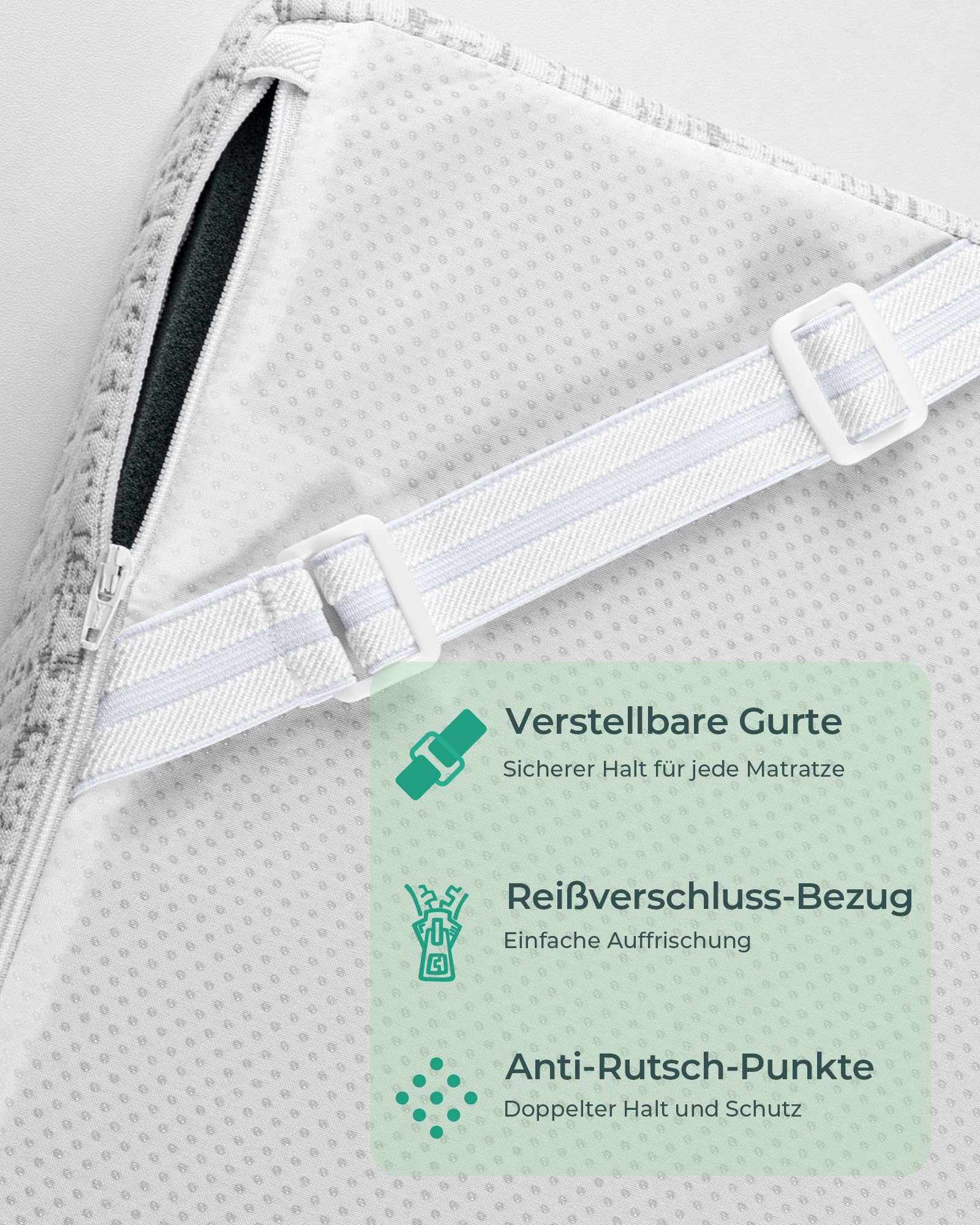 Der atmungsaktive und waschbare Bezug fördert zusammen mit dem Gelschaum ein konstant trockenes und hygienisches Schlafklima. Die rutschfesten Bänder gewährleisten eine unkomplizierte Anwendung und dauerhaften Halt auf jeder Art von Matratze, sei es im Boxspringbett oder auf dem Schlafsofa.