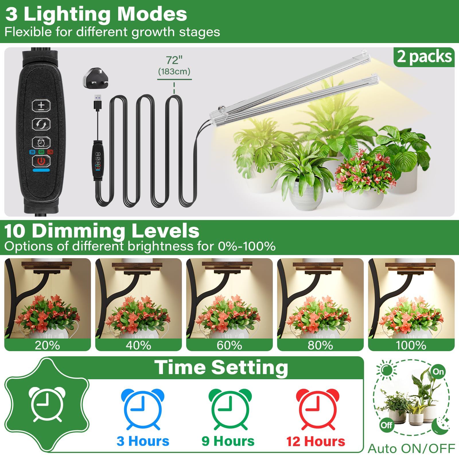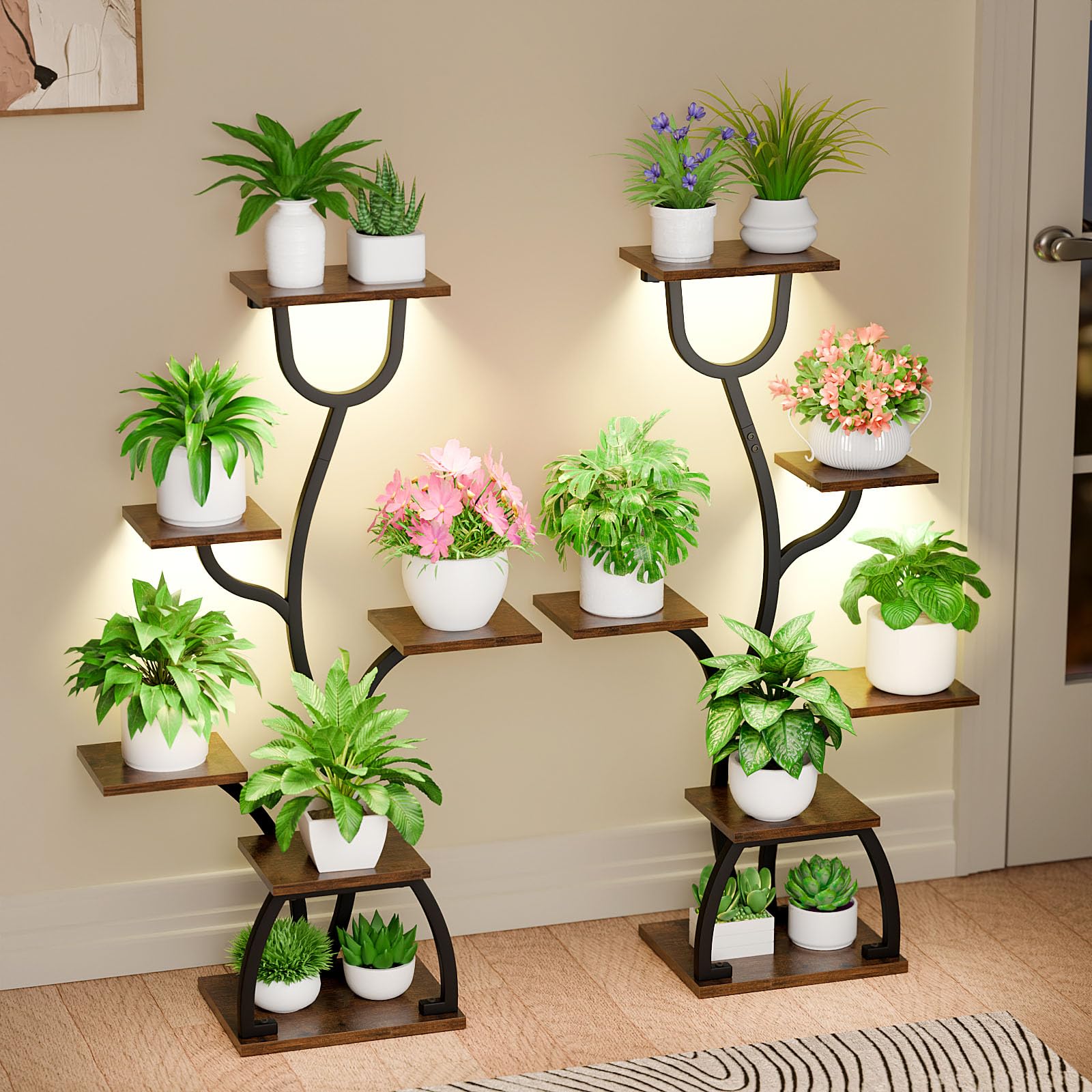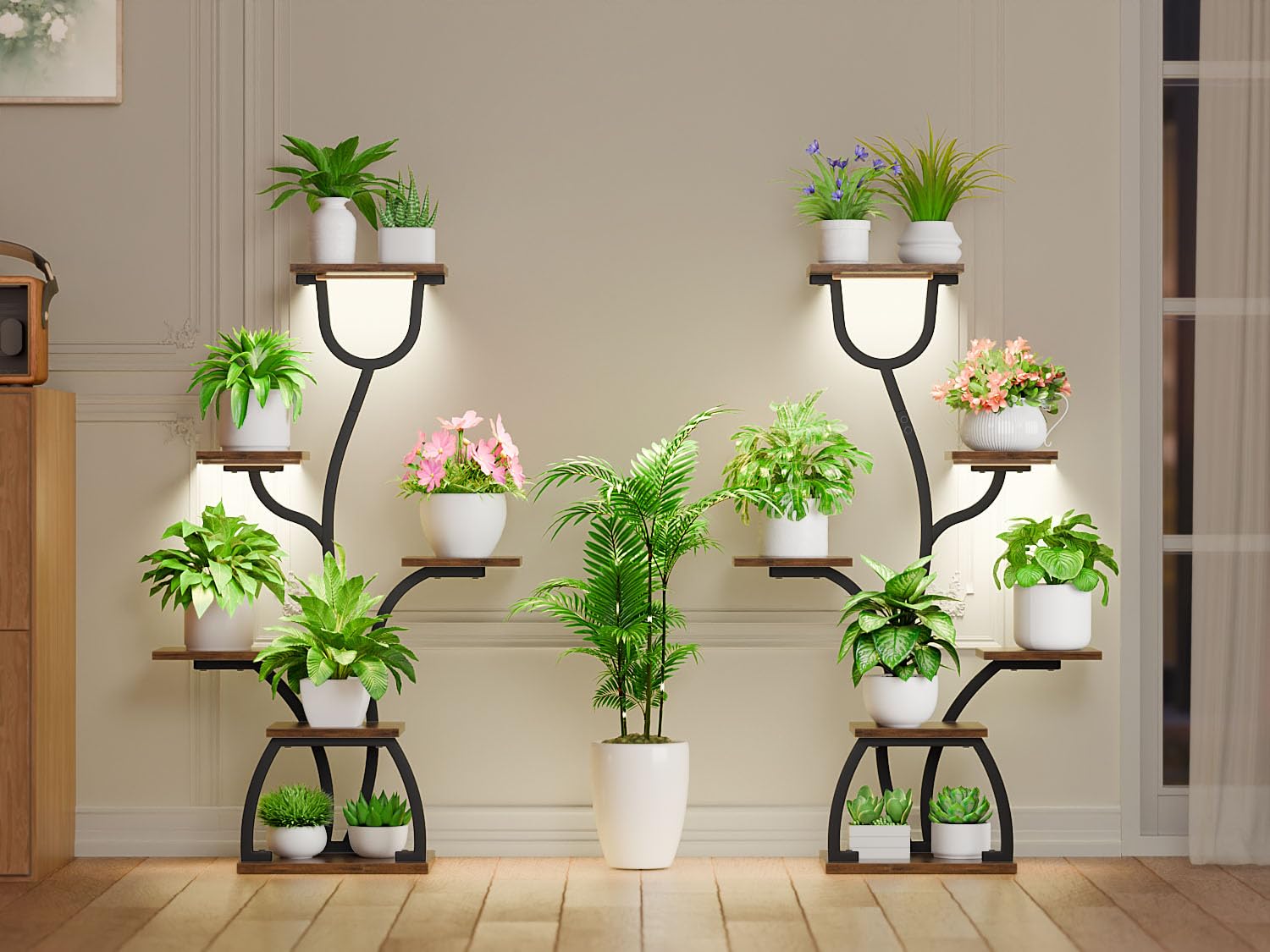 Präsentieren Sie Ihre Pflanzen stilvoll und fördern Sie gleichzeitig ihr Wachstum mit diesem eleganten Pflanzenregal im Doppelpack. Es kombiniert ein formschönes Design mit einer integrierten, funktionellen Wachstumsbeleuchtung, ideal für jeden Wohnbereich.