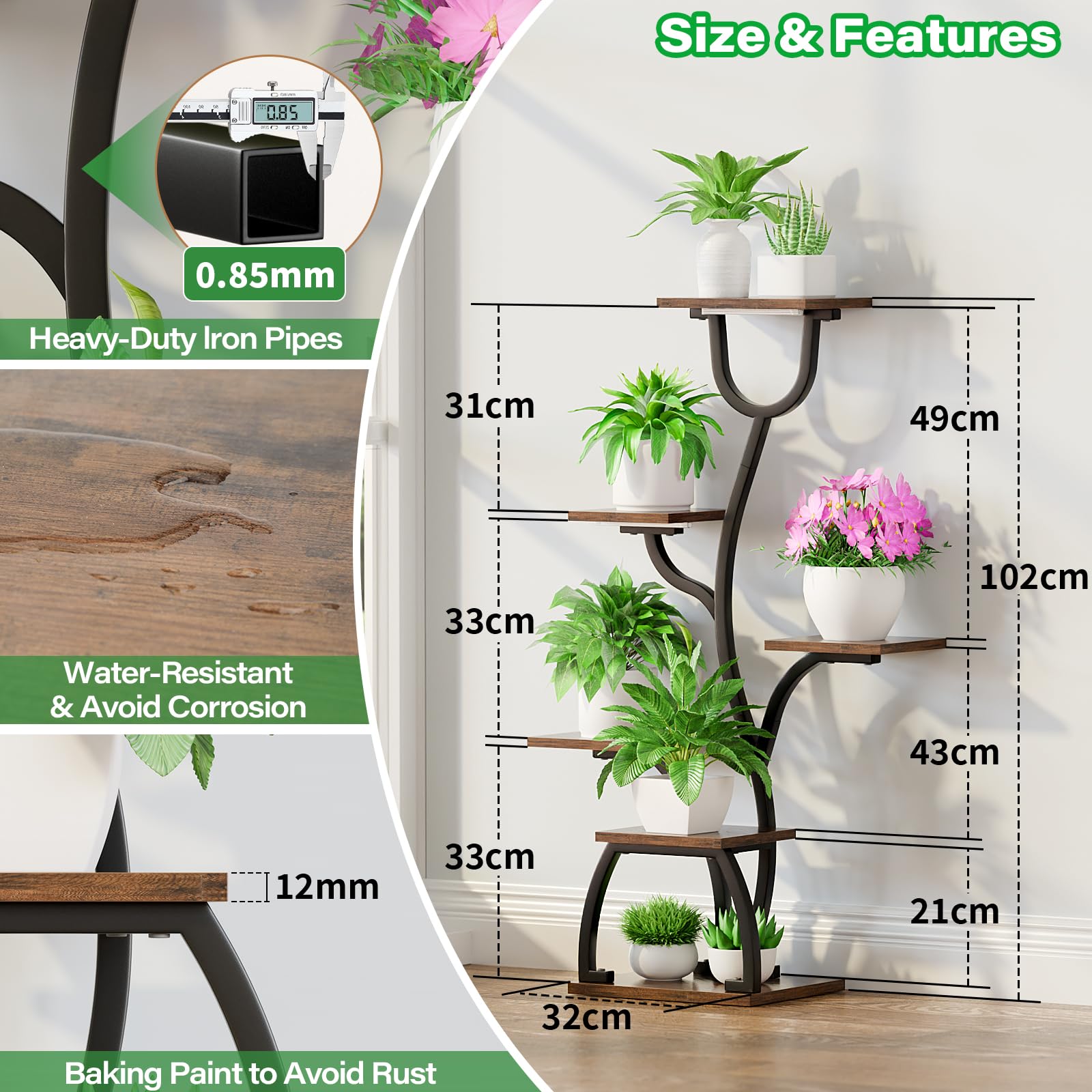 - Grosszügiges Platzangebot: Mit seinen sechs Etagen bietet dieser Blumenständer ausreichend Platz für mindestens sechs Blumentöpfe. Die versetzte Anordnung stellt sicher, dass jede Pflanze optimal Licht erhält.
