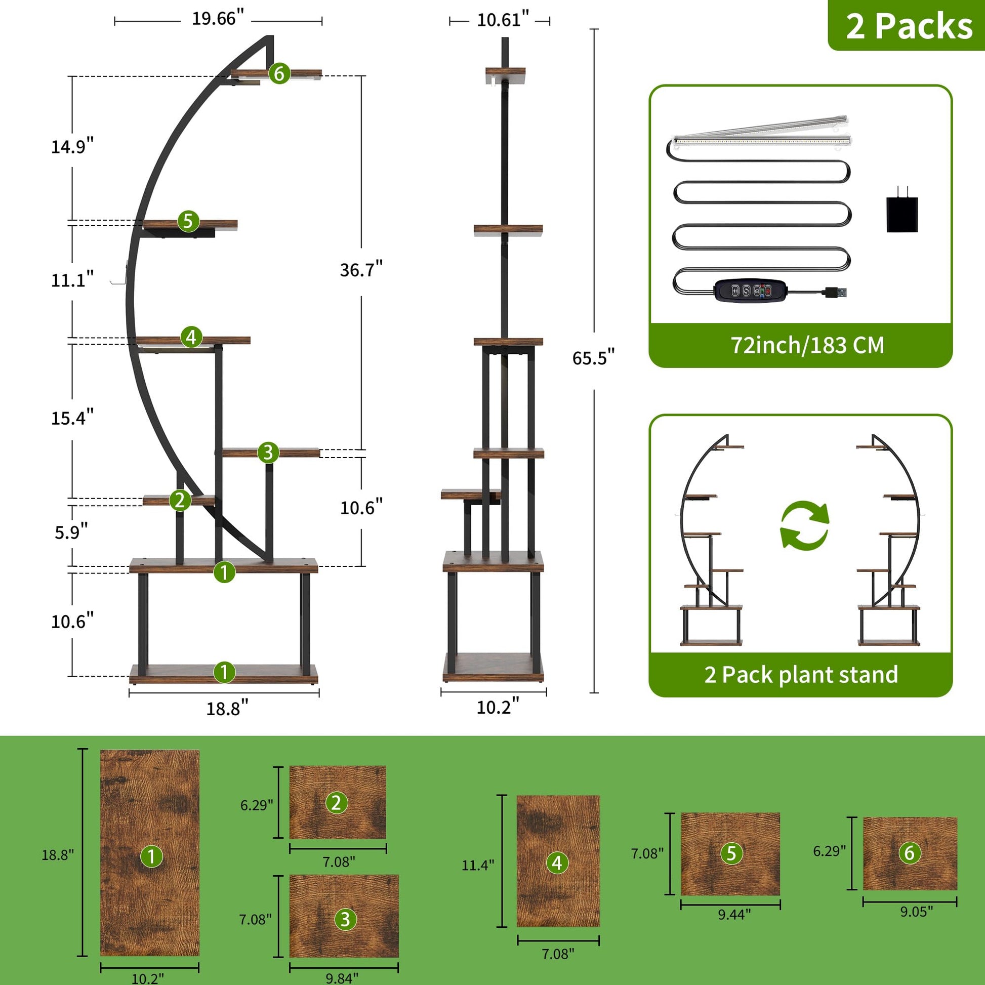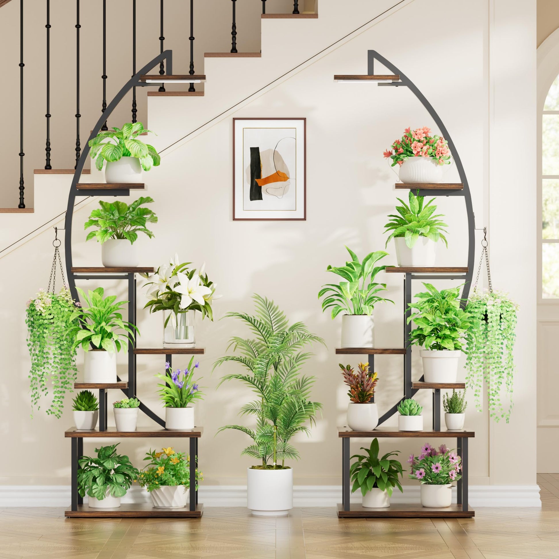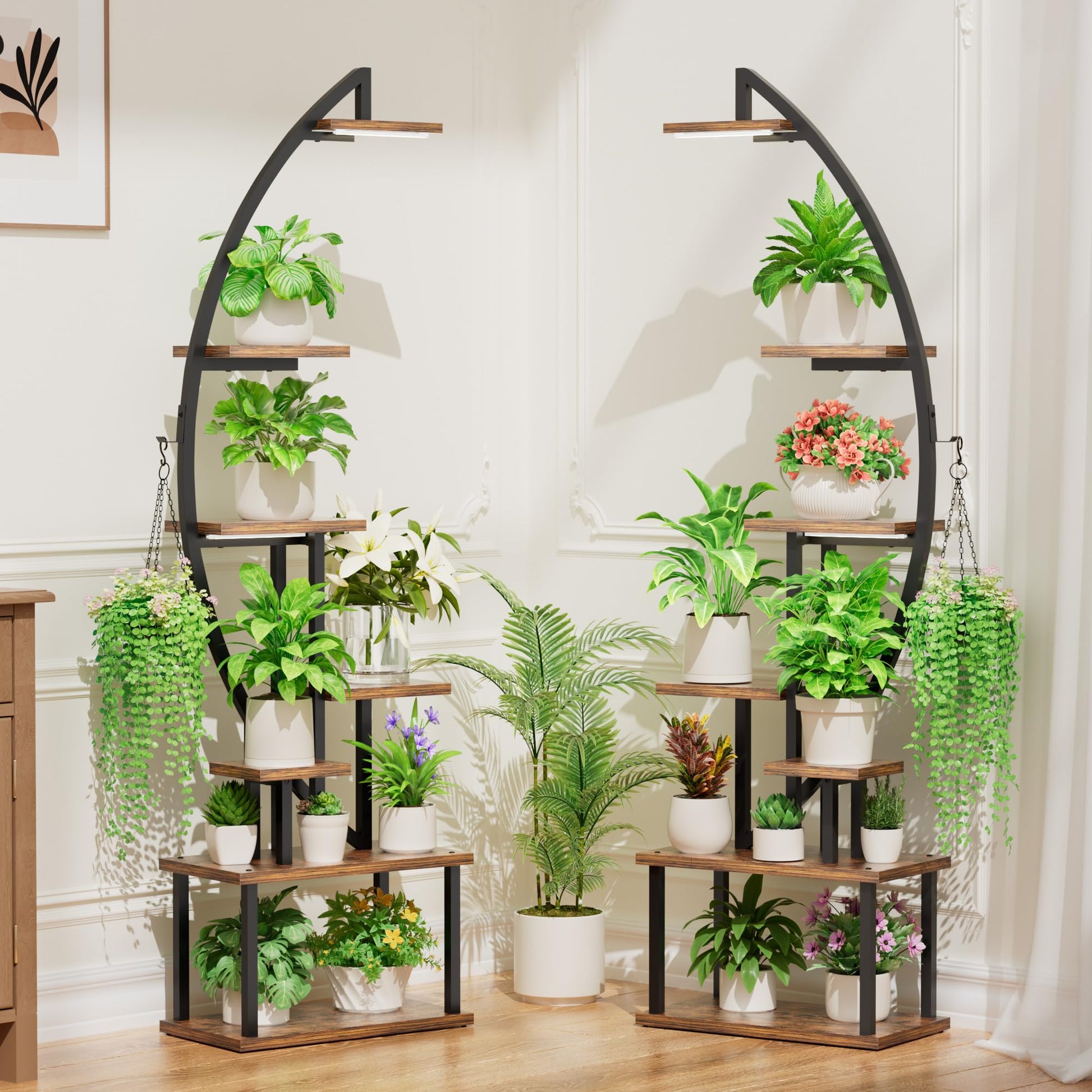 Das Set besteht aus zwei separaten 7-stöckigen Regalen, die Sie zusammen in einer Halbmond-Form oder einzeln an verschiedenen Orten aufstellen können. Mit 14 Topfständern und 2 Aufhängern bietet das Set grosszügigen Platz für eine umfangreiche Sammlung von mindestens 16 Pflanzen, abhängig von deren Grösse.