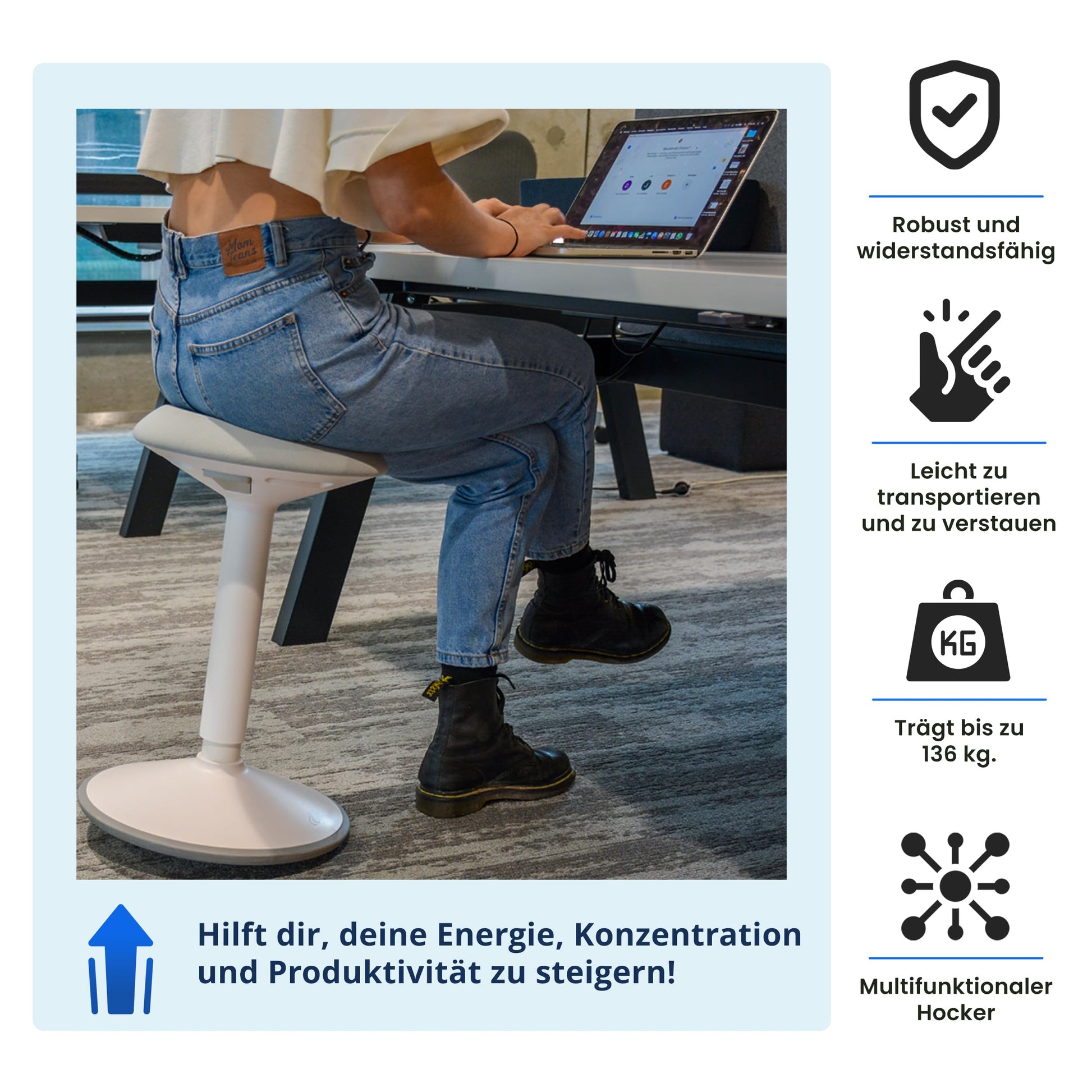 Verwandeln Sie Ihren Arbeitsplatz in eine Zone der Produktivität. Dieser Hocker wurde entwickelt, um Energie und Elan zu steigern und Ihnen zu helfen, Ihre täglichen Aufgaben mit Schwung zu bewältigen. Die einfache Höhenverstellung mittels zweier Knöpfe unter der Sitzfläche ermöglicht eine schnelle Anpassung an jede Arbeitssituation. So geniessen Sie stets eine ergonomisch korrekte Haltung und entlasten Ihren Körper auch bei langen Arbeitszeiten.