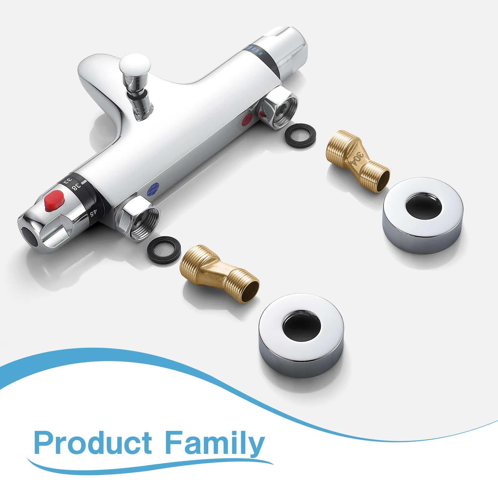 Im Lieferumfang enthalten sind die Thermostat-Armatur selbst sowie zwei Sätze dekorativer Abdeckungen in unterschiedlichen Stilen (zufällige Auswahl). Bitte beachten Sie, dass ein Brauseschlauch und eine Handbrause nicht enthalten sind und separat erworben werden müssen.