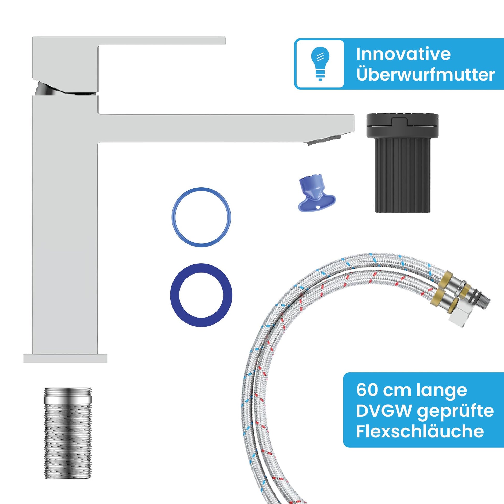 Die Armatur wird als Komplettset für eine schnelle Installation geliefert. Es enthält neben dem Einhebelmischer eine detaillierte Anleitung, zwei DVGW-geprüfte Anschlussschläuche (G 3/8 Zoll) und einen passenden Perlatorschlüssel, sodass kein zusätzliches Zubehör benötigt wird.