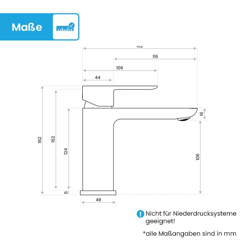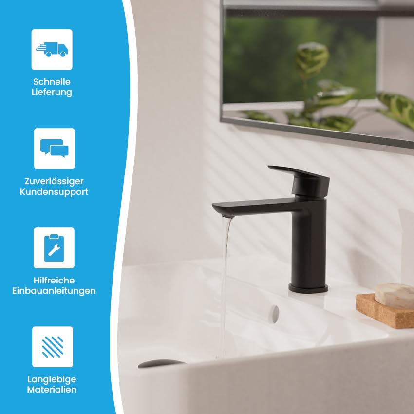 - Edles Design: Ein flacher Auslauf und eine hochwertige Oberfläche in stilvollem Matt-Schwarz setzen ein optisches Highlight an Ihrem Waschtisch.