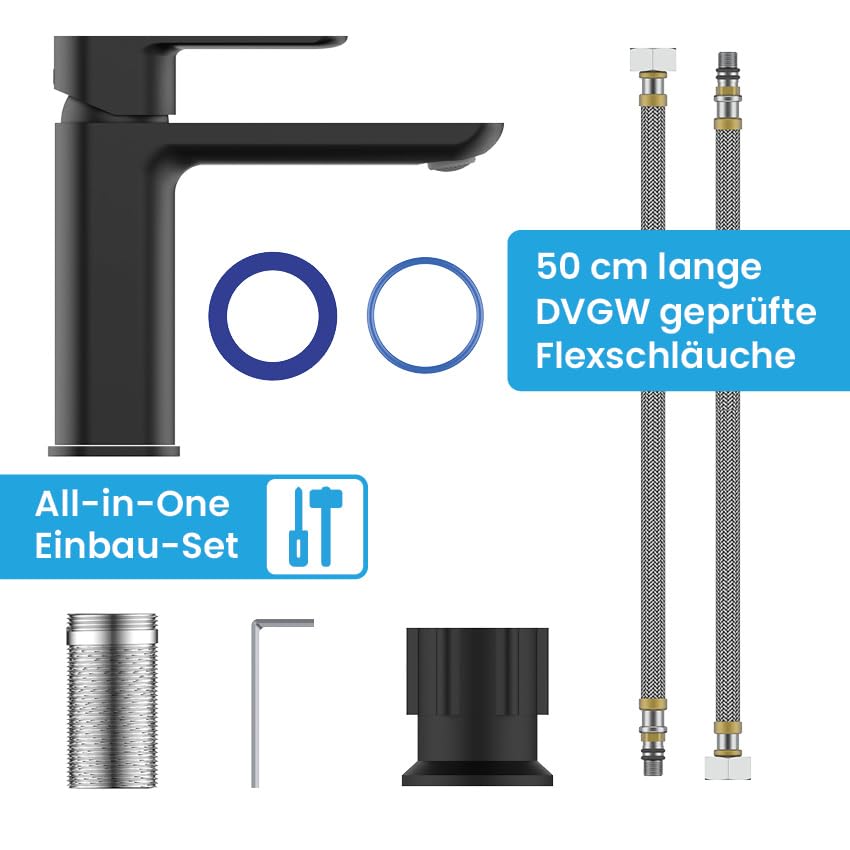 - Umfassendes Montage-Set: Beinhaltet alles Notwendige für eine reibungslose Installation, inklusive zweier DVGW-geprüfter Anschlussschläuche mit 50 cm Länge.