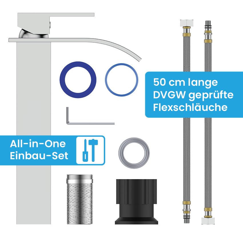 - Genormte Anschlüsse: Dank der Standard-Anschlussgrösse G 3/8 Zoll und 50 cm langen Flexschläuchen kann die Armatur direkt und ohne Anpassungen in Betrieb genommen werden.