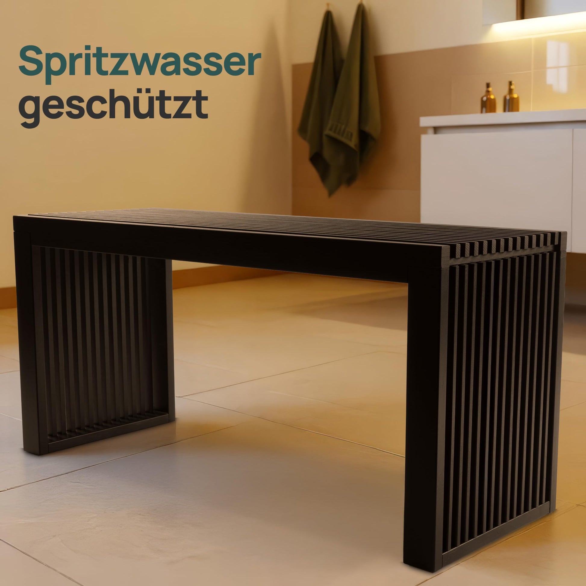 Ja, die Bank ist hervorragend für das Badezimmer geeignet. Der Bambus ist mit einem schwarzen Lack versiegelt, was die Oberfläche widerstandsfähig gegen Feuchtigkeit macht und sie sehr pflegeleicht macht. Sie kann als Badhocker oder Ablage für Handtücher genutzt werden.