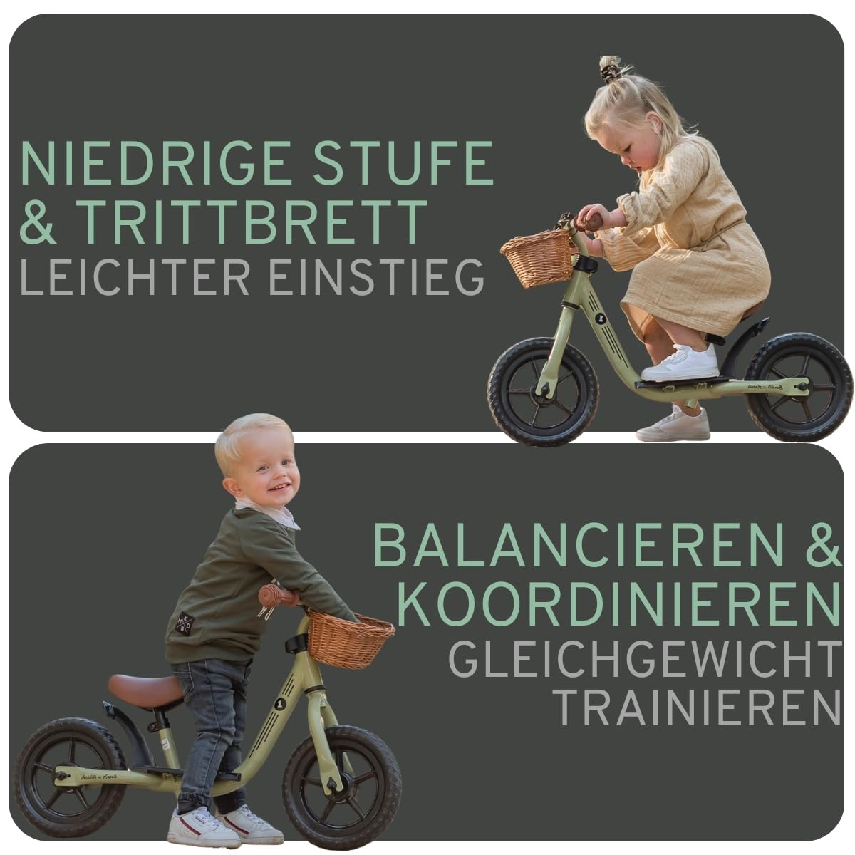 - Tiefer Einstieg mit Trittbrett: Ermöglicht Kindern ab 2 Jahren ein müheloses und sicheres Auf- und Absteigen sowie eine bequeme Ablage für die Füsse während der Fahrt.