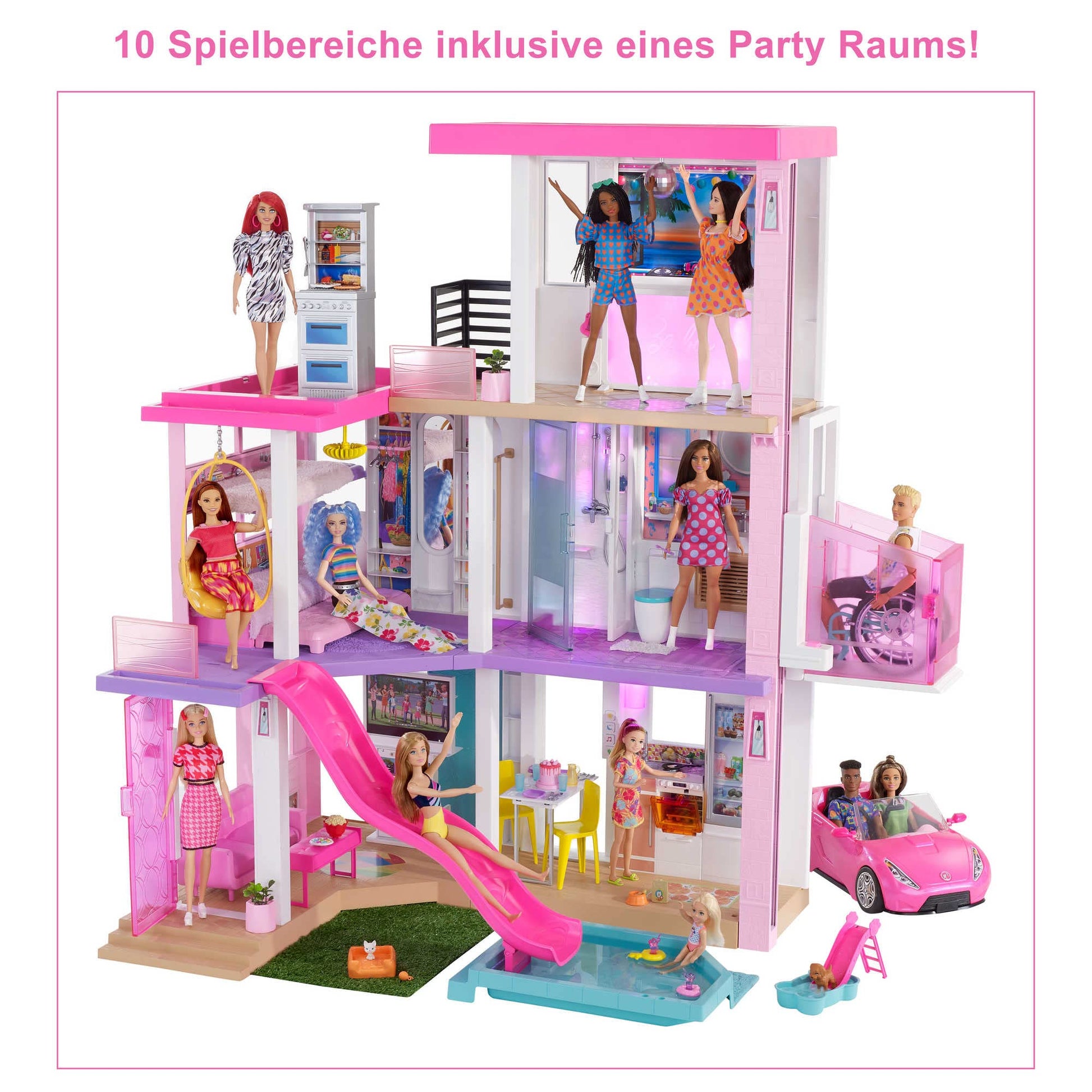 Das Set enthält das dreistöckige Puppenhaus, einen Pool mit Rutsche und über 75 Zubehörteile wie Möbel und Dekoration. Bitte beachten Sie: Puppen, ein Fahrzeug oder ein Rollstuhl sind NICHT im Lieferumfang enthalten und müssen separat erworben werden.