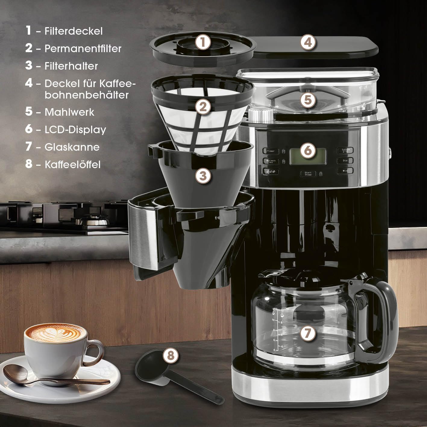 - Intuitive Bedienung: Ein übersichtliches Menü ermöglicht die unkomplizierte Einstellung von Timer und Mahlgrad auf Knopfdruck.