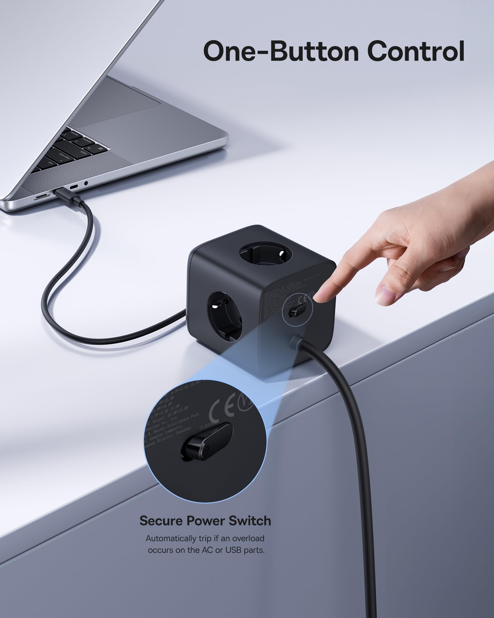 Sie können bis zu 6 Geräte gleichzeitig mit Strom versorgen. Der Würfel kombiniert 3 AC-Steckdosen, 2 USB-C-Anschlüsse und 1 USB-A-Anschluss, ideal um Laptop, Tablet, Smartphone und mehr zugleich zu laden.