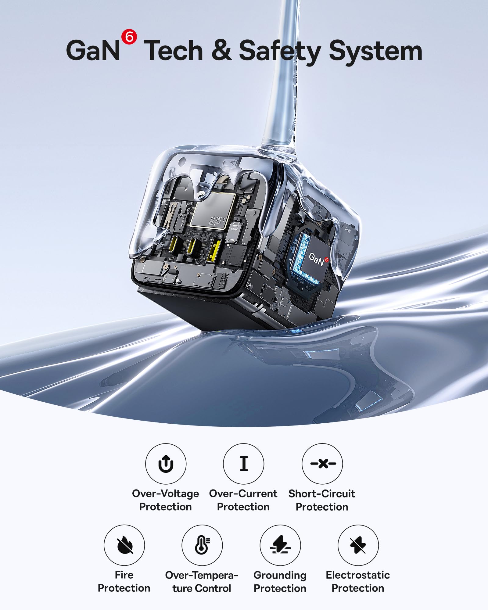 Dank der fortschrittlichen GaN6-Technologie und einer hohen DC-Gesamtleistung von 67 Watt werden Ihre Geräte ultraschnell aufgeladen. Ein Tablet kann beispielsweise in nur 20 Minuten zu 50 % geladen werden.