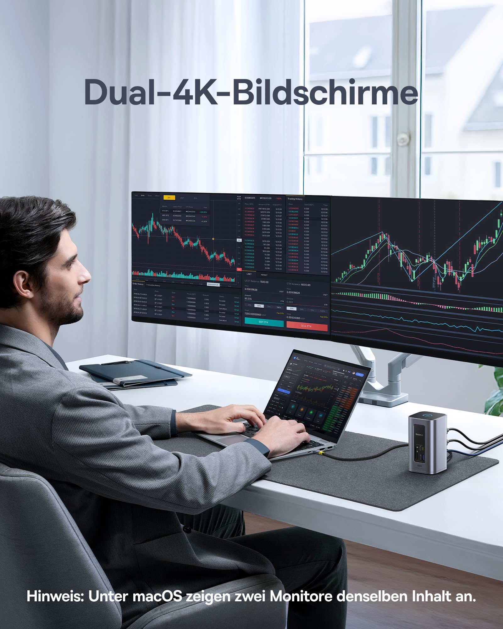 Sie ist perfekt für alle, die ihren Arbeitsplatz optimieren und Kabelsalat reduzieren möchten – im Büro, Home-Office oder unterwegs. Besonders Berufstätige und Kreative in Bereichen wie Grafikdesign, Videobearbeitung oder Datenanalyse profitieren von der Dual-4K-Monitor-Unterstützung für maximale Produktivität und der blitzschnellen 10 Gbit/s Datenübertragung.