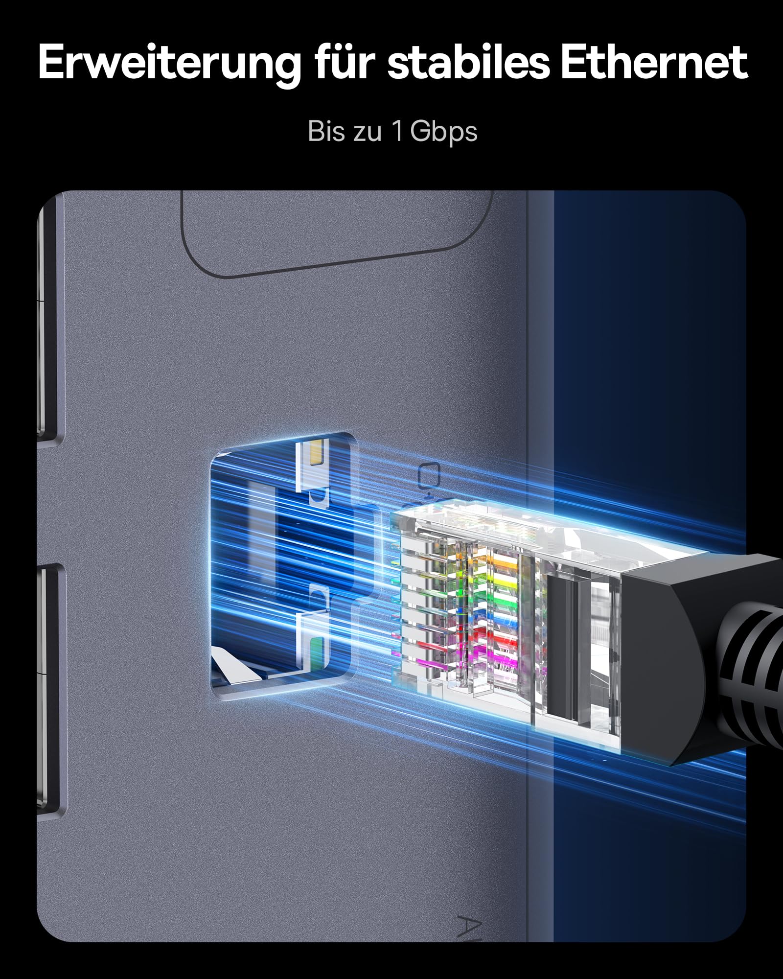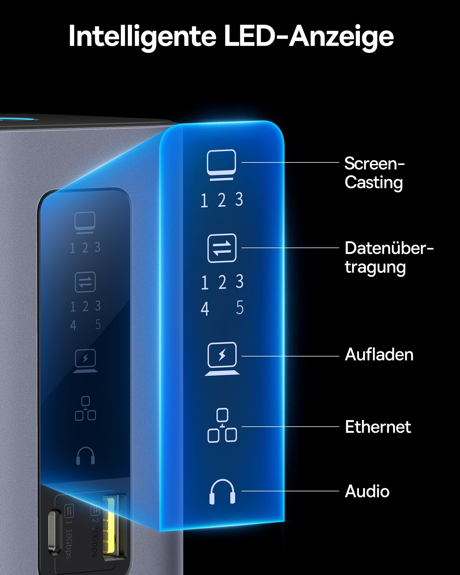 - 11-in-1 Konnektivität: Umfasst drei HDMI-Anschlüsse, einen USB-C 10Gbps-Port, zwei USB-A 10Gbps-Ports, zwei USB-A 480Mbps-Ports, einen 100W PD-Eingang, Gigabit Ethernet und eine 3.5mm Audiobuchse.