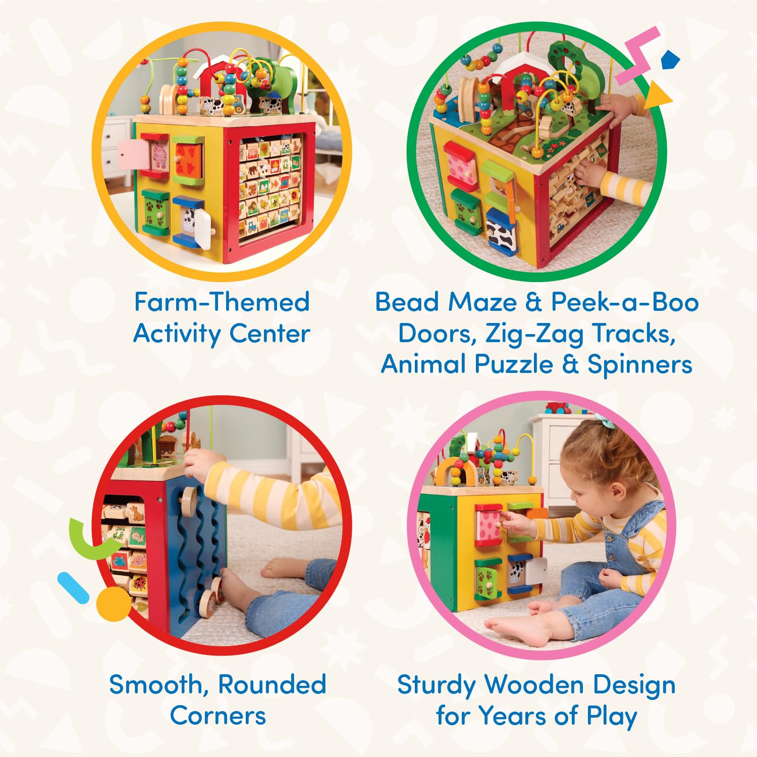 Der Würfel ist ein komplettes Spielzentrum mit Aktivitäten auf fünf Seiten und der Oberseite. Dazu gehören Türchen zum Öffnen, drehbare Tierfiguren, Zick-Zack-Pfade und eine grosse Motorikschleife mit Perlen, einem Traktor und Bauernhoftieren.