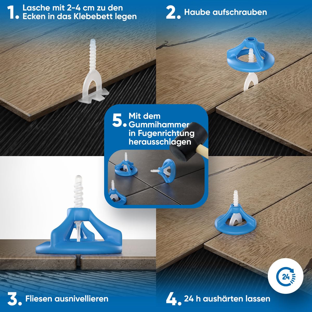 Der Hauptvorteil ist das Erreichen einer absolut ebenen Fliesenoberfläche ohne störende Kanten oder 'Überzähne', was zu einem hochprofessionellen Ergebnis führt. Ein weiterer Vorteil ist die einfache Handhabung: Für die Verwendung der Gewindelaschen mit den passenden Zughauben wird kein zusätzliches Spezialwerkzeug benötigt.