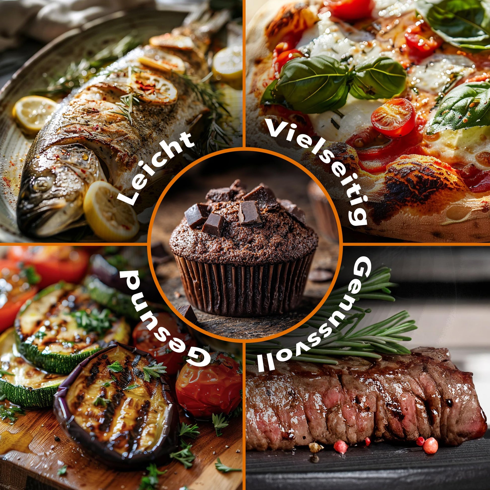 - Umfangreiches Zubehör: Inklusive eines Pizzasteins für authentischen Geschmack und eines Gusseisenblechs für rustikale Gerichte.