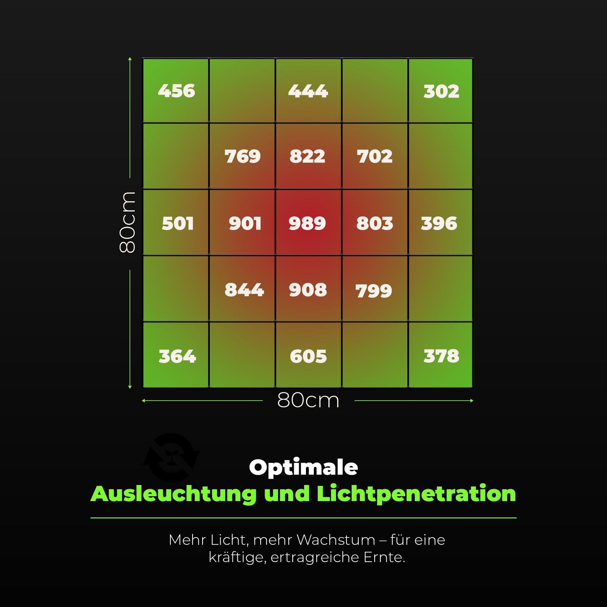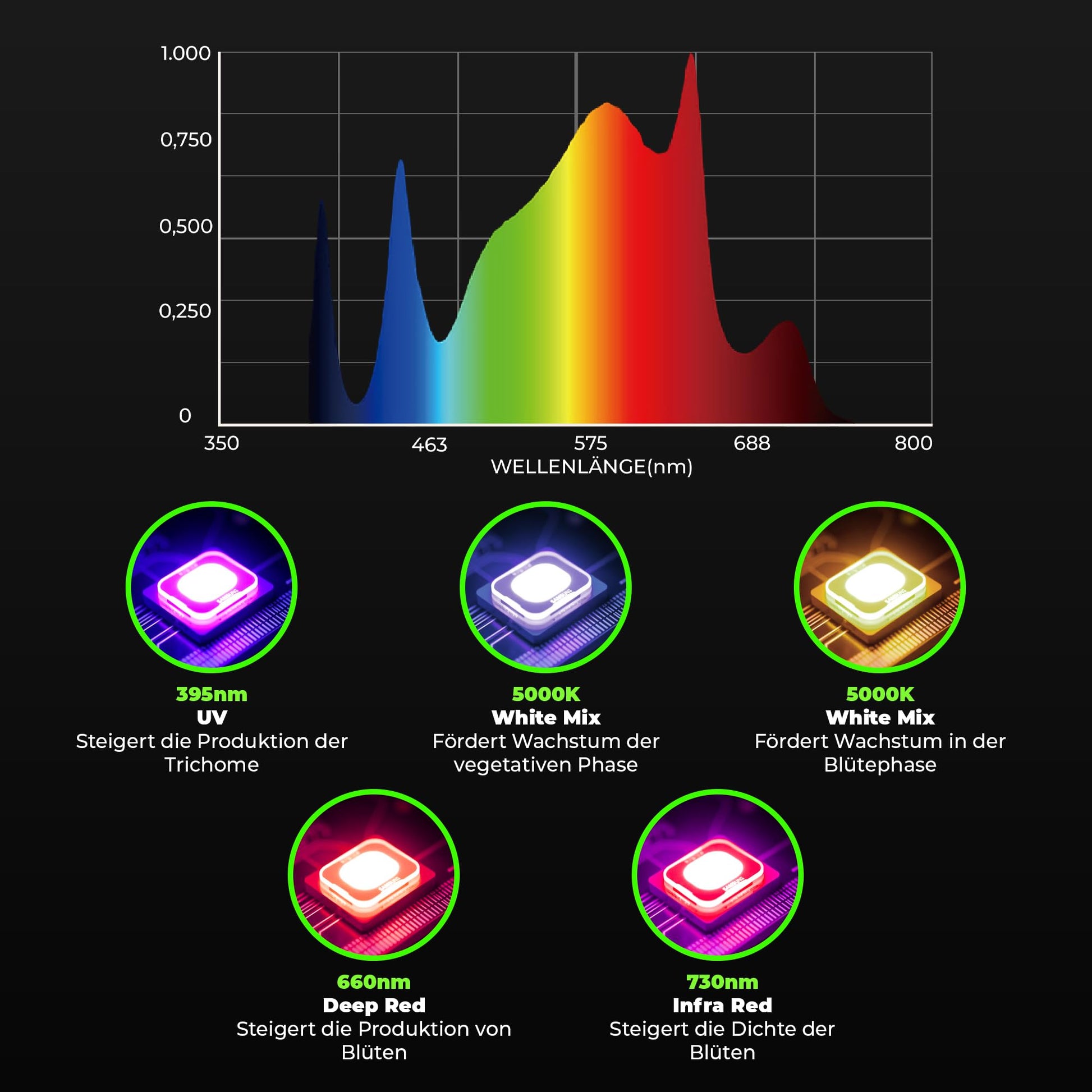 - Innovatives ProLine Vollspektrum: Das einzigartige Lichtspektrum simuliert perfekt das natürliche Sonnenlicht, indem es auch UV- und Infrarot-Dioden integriert, was zu einer massiven Ertragssteigerung führt.
