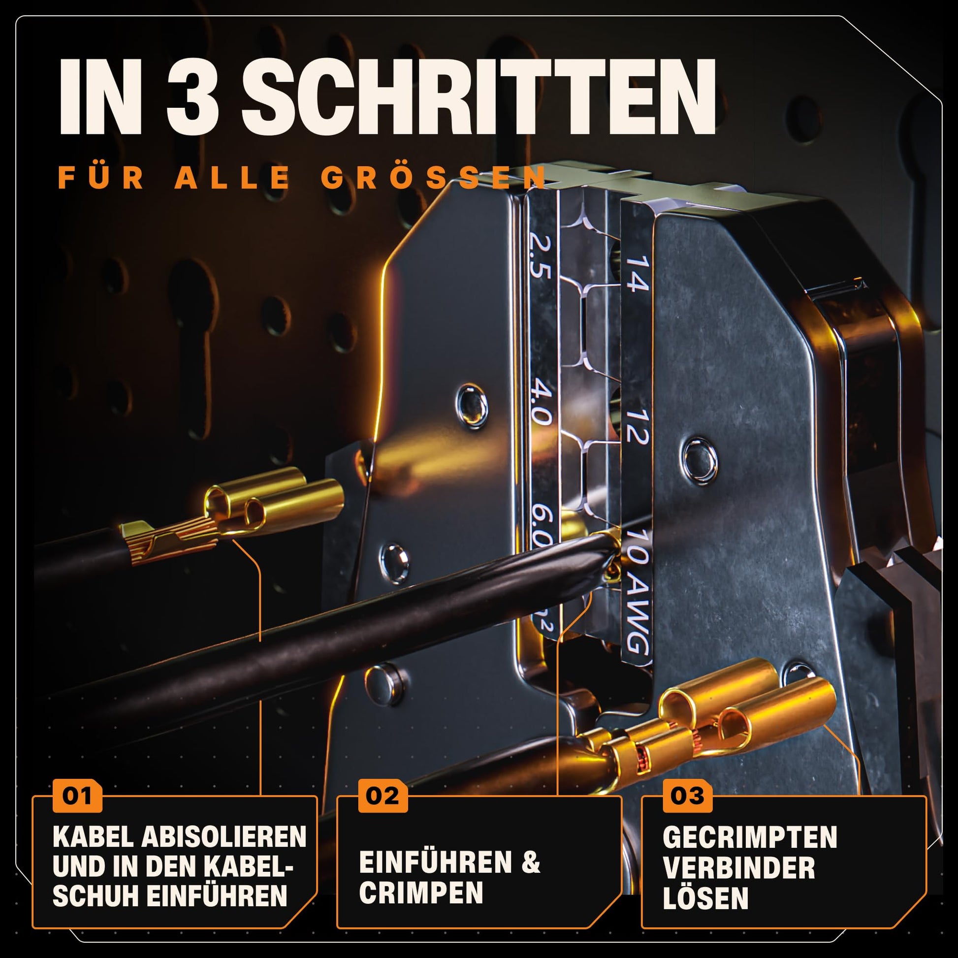 - Universell einsetzbar: Eignet sich perfekt zum Verpressen von diversen Kabelschuhen, Flachsteckern, Flachsteckhülsen, Aderendhülsen, Solar-Verbindern und weiteren gängigen Verbindertypen.