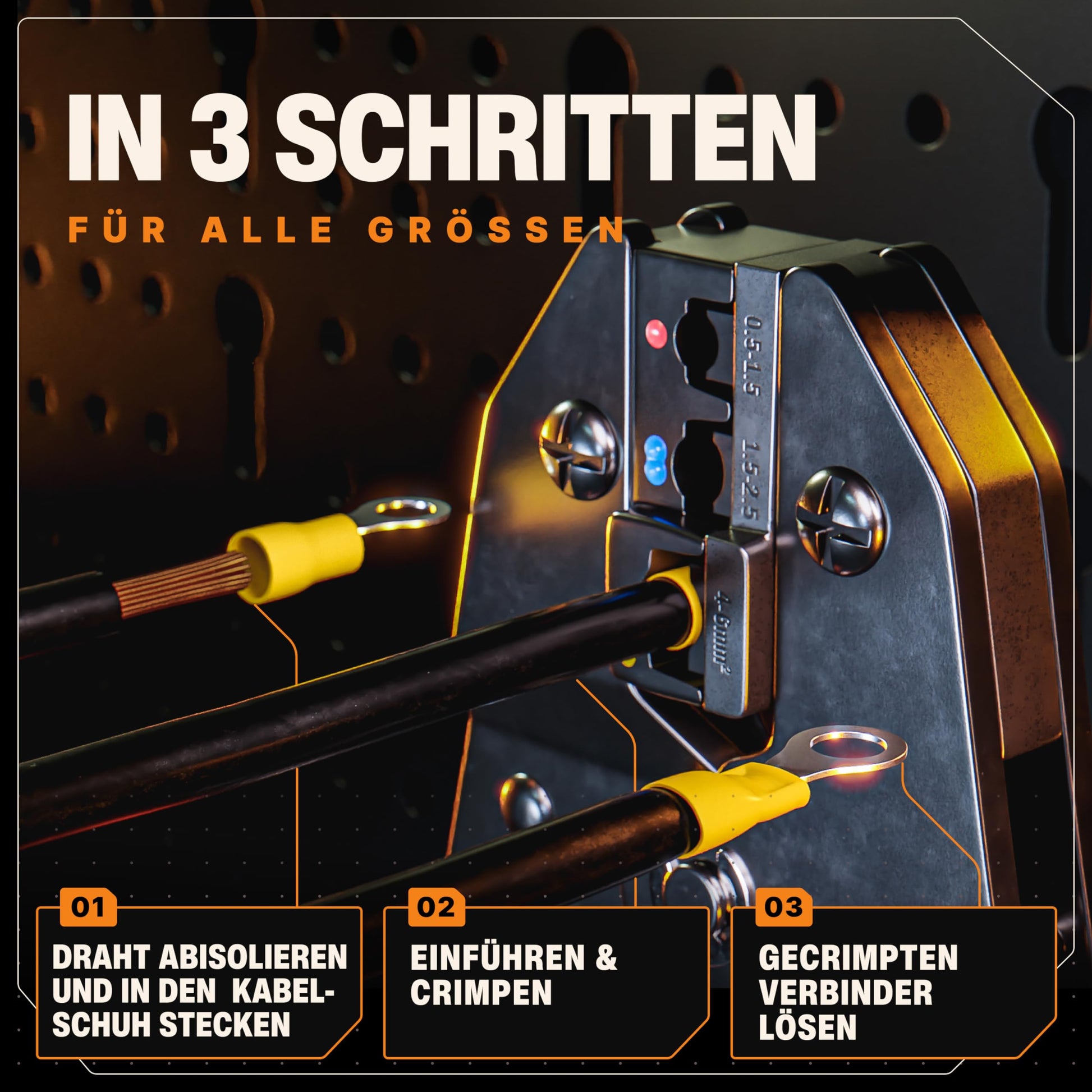 Die Zange ist für das zuverlässige Verpressen von Kabelschuhen auf Kabeln mit einem Querschnitt von 0,5 mm² bis 6,0 mm² ausgelegt. Ja, die Crimpkraft ist präzise einstellbar, um für jede Verbindung das optimale und sicherste Ergebnis zu gewährleisten.