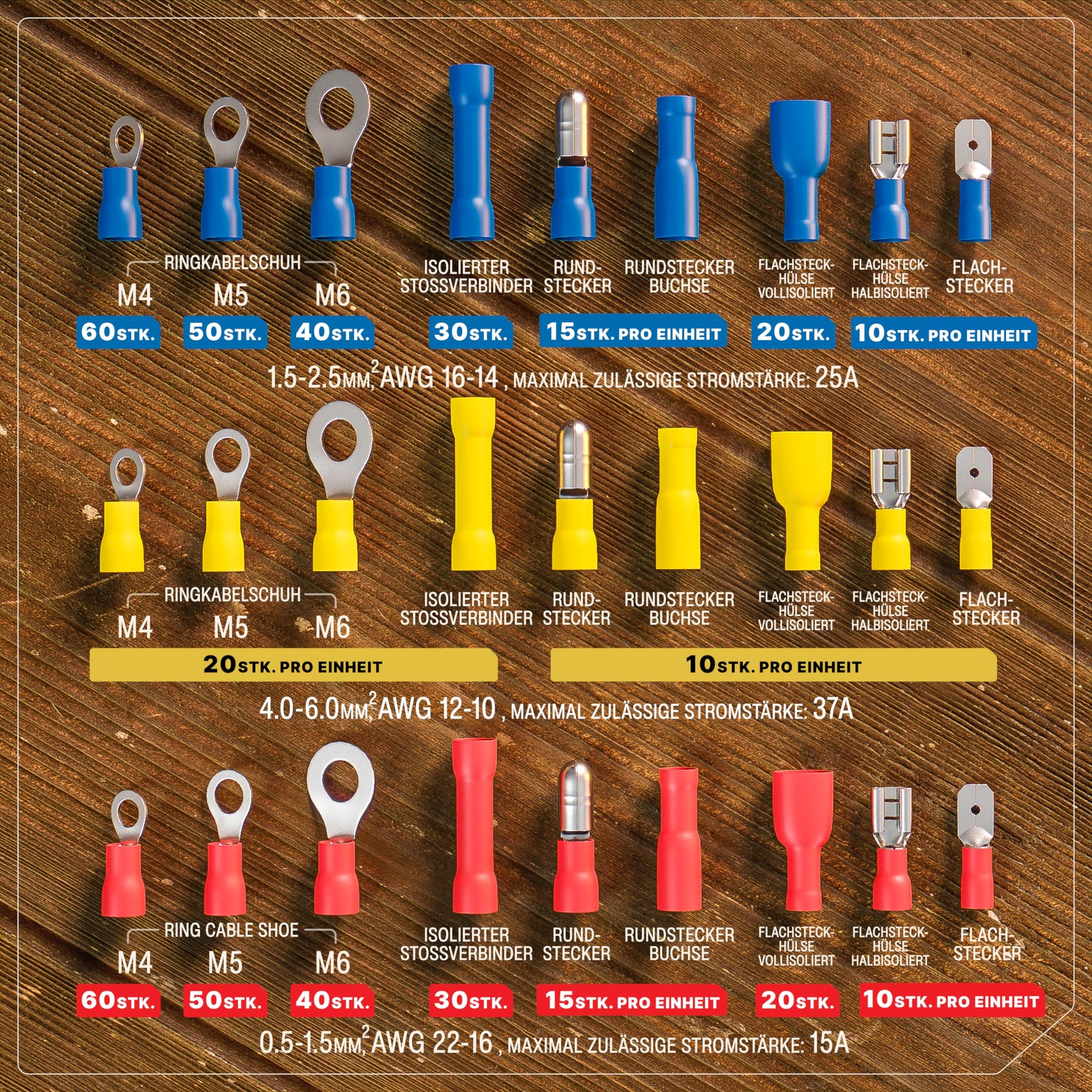 - Umfassendes Zubehör: Eine praktische Sortimentsbox mit 700 Kabelschuhen der gängigsten Ausführungen (Flachstecker, Rundstecker, Ringkabelschuhe, Stossverbinder etc.) ist im Lieferumfang enthalten.
