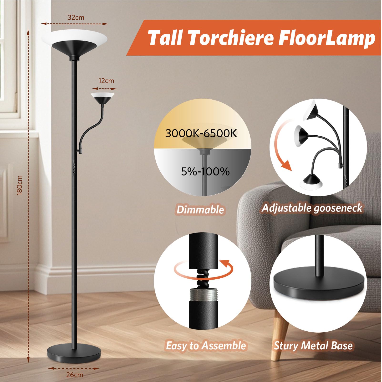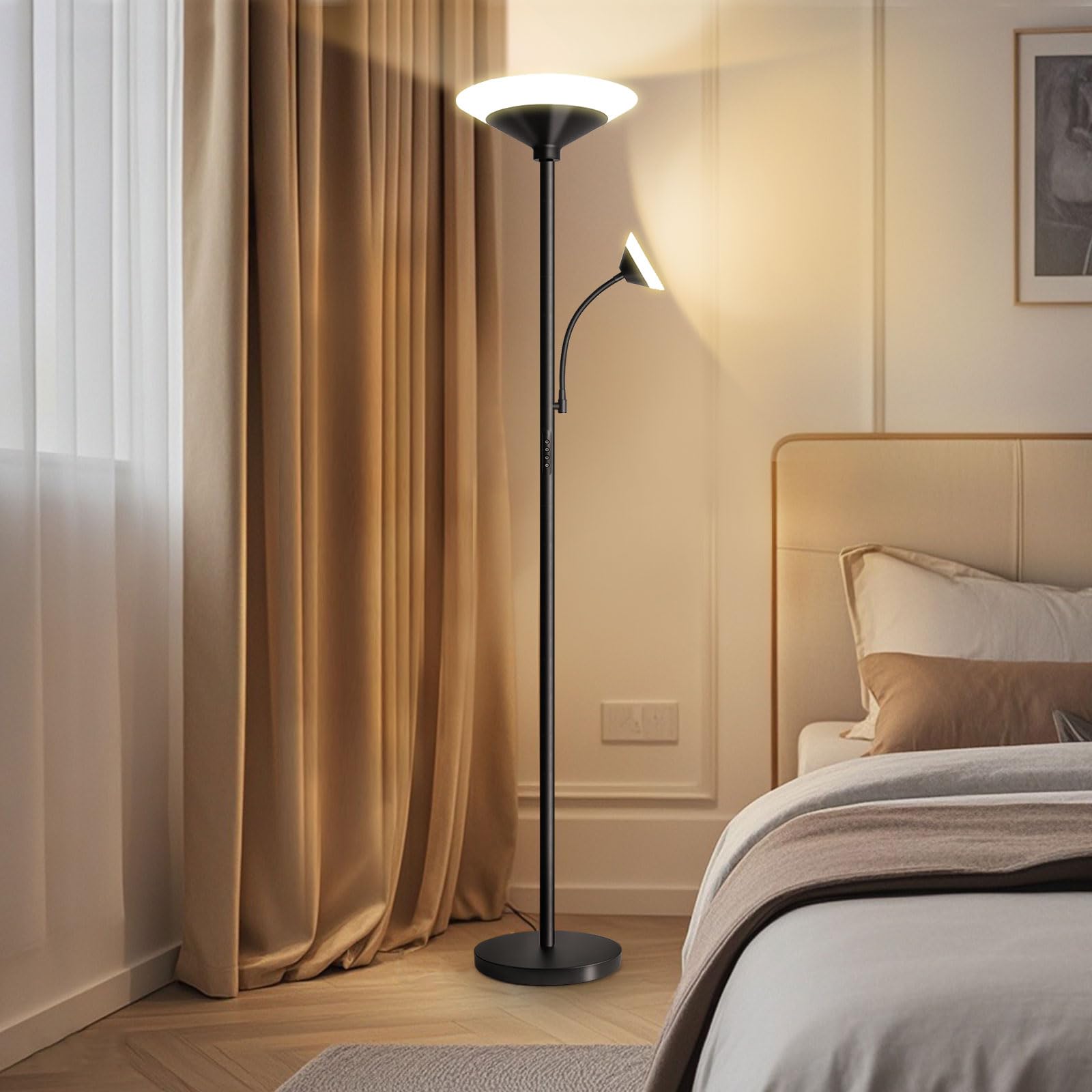 Diese moderne Stehlampe vereint elegantes Design mit vielseitiger Funktionalität und spendet helles, anpassbares Licht für jeden Raum. Sie kombiniert einen leistungsstarken Deckenfluter mit einer flexiblen Leselampe und wird so zur idealen Beleuchtungslösung für Ihr Zuhause oder Büro.