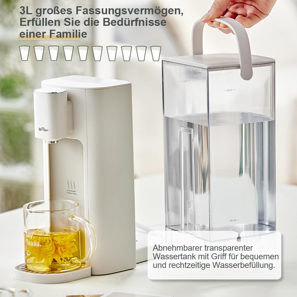 Der grosszügige 3-Liter-Wassertank versorgt die ganze Familie oder das Büroteam mühelos mit heissem Wasser. Für höchsten Komfort lässt sich der Tank einfach abnehmen, befüllen und reinigen, während Sie den Füllstand durch das transparente Design stets im Blick behalten.