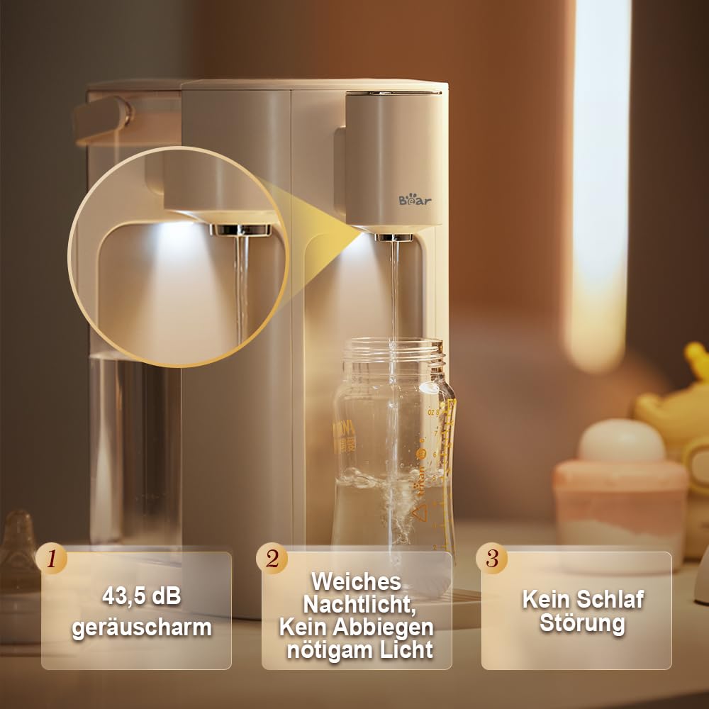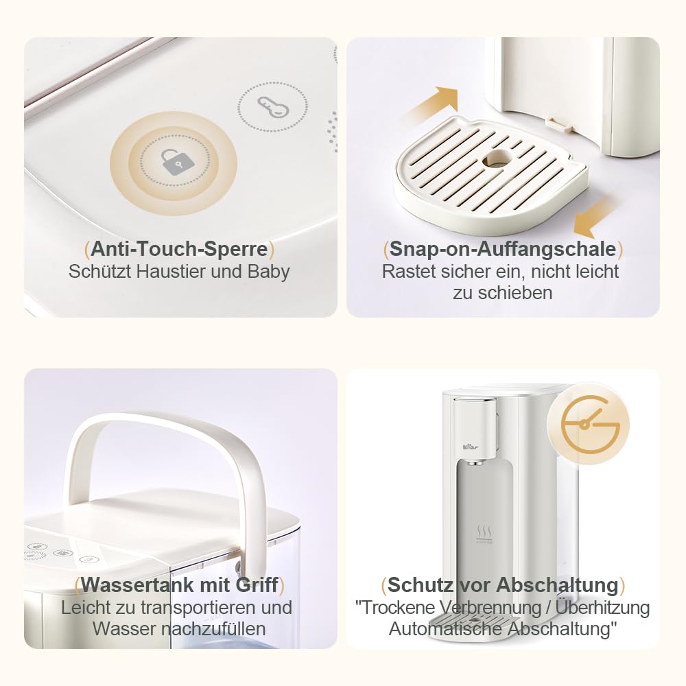 Der Spender bietet 6 präzise Temperaturstufen für die perfekte Zubereitung: 45°C ist ideal für Babynahrung, 60-70°C für empfindliche Grün- und Weisstees, 80-85°C für kräftigere Teesorten und 90°C für schwarzen Tee oder Kaffee. So gelingt jedes Heissgetränk optimal.