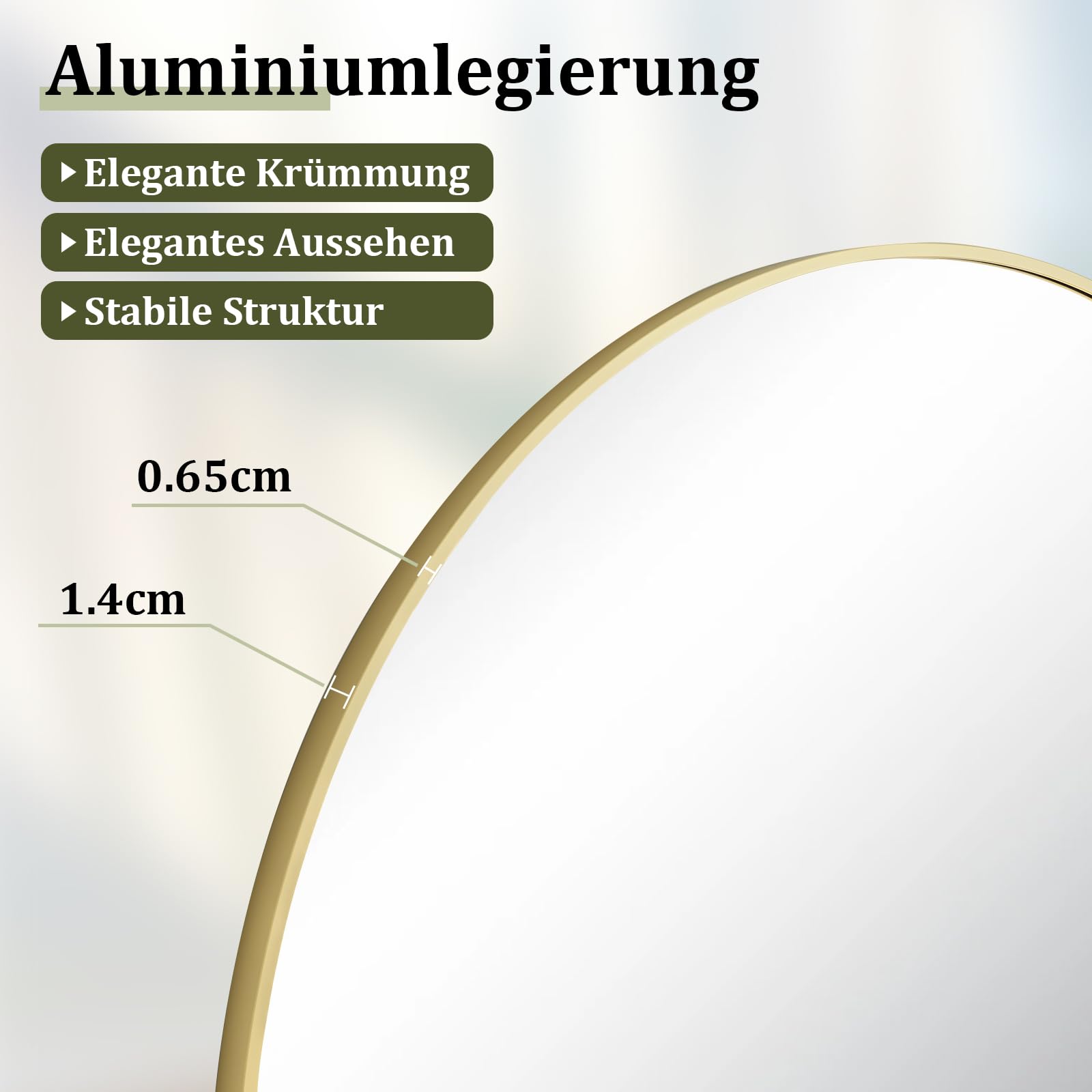 Der Rahmen ist in den matten Farben Gold, Schwarz, Weiss und Silber erhältlich. Durch sein zeitloses und elegantes Bogen-Design fügt sich der Spiegel nahtlos in diverse Einrichtungsstile ein, von modern über minimalistisch bis klassisch.