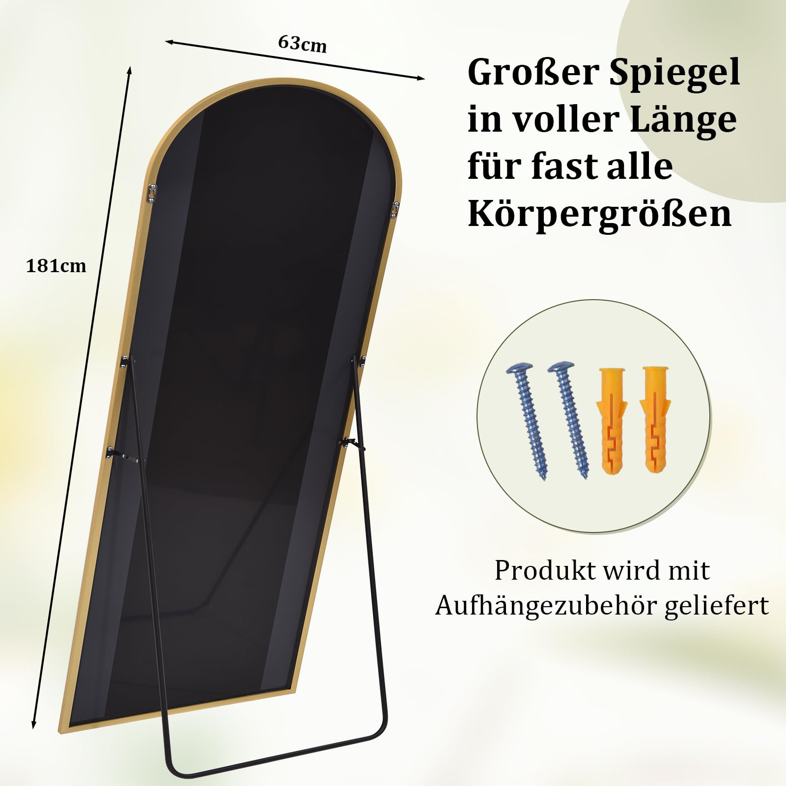 Dieser Ganzkörperspiegel ist ein wahres Multitalent. Dank seines leichten Gewichts und des durchdachten Designs kann er mühelos von einer einzigen Person platziert und bei Bedarf umgestellt werden. Das Montagematerial für eine sichere Wandbefestigung ist bereits im Lieferumfang enthalten, ebenso wie der ausklappbare Ständer für eine sofortige, freistehende Nutzung.
