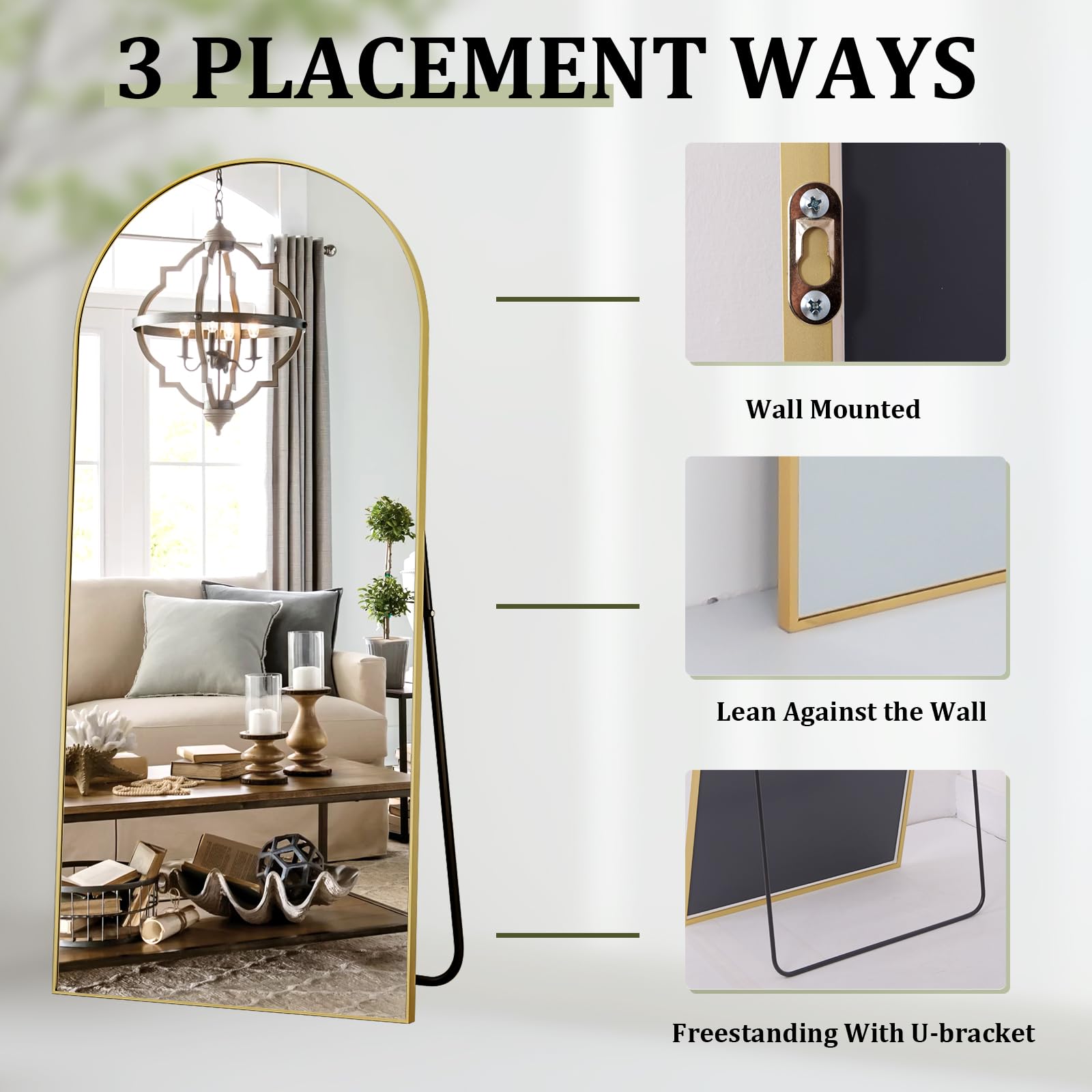 - Elegantes Bogendesign: Ein zeitloser, gewölbter Spiegel, der sich nahtlos in diverse Einrichtungsstile einfügt und optische Akzente setzt.