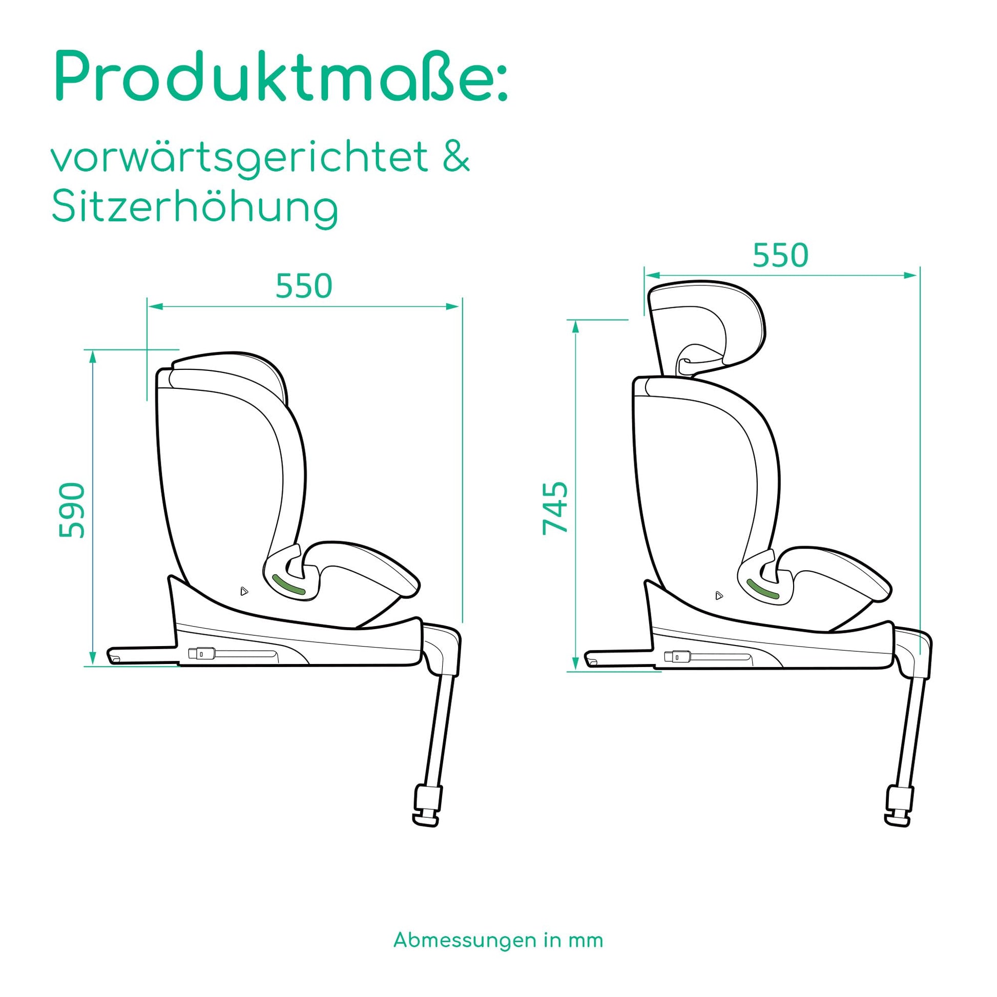 - Sitzerhöhungs-Modus (100–150 cm / 4–12 Jahre): Für grössere Kinder wird der Sitz zur komfortablen Sitzerhöhung, bei der die Sicherung mit dem fahrzeugeigenen Sicherheitsgurt erfolgt.