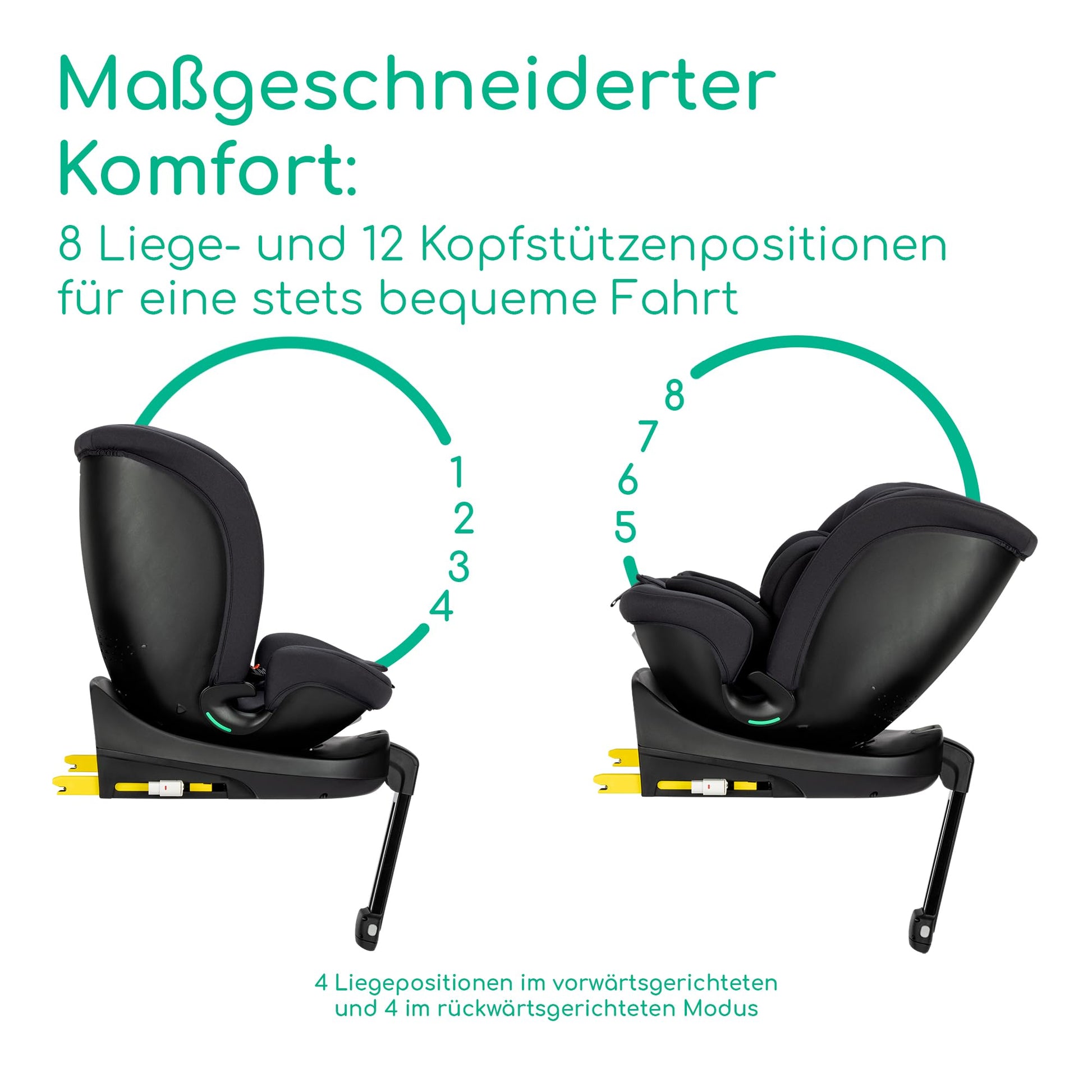 Die 360°-Drehfunktion ist ein echter Alltagshelfer. Drehen Sie den Sitz einfach zur offenen Autotür, um Ihr Kind ohne Anstrengung und Verrenkungen an- oder abzuschnallen. Auch der Wechsel der Fahrtrichtung wird so zum Kinderspiel. Dank der vielfältigen Einstellmöglichkeiten für die Liegeposition und die Kopfstütze reist Ihr Kind immer in der optimalen und bequemsten Haltung – egal ob es schläft oder neugierig aus dem Fenster schaut.