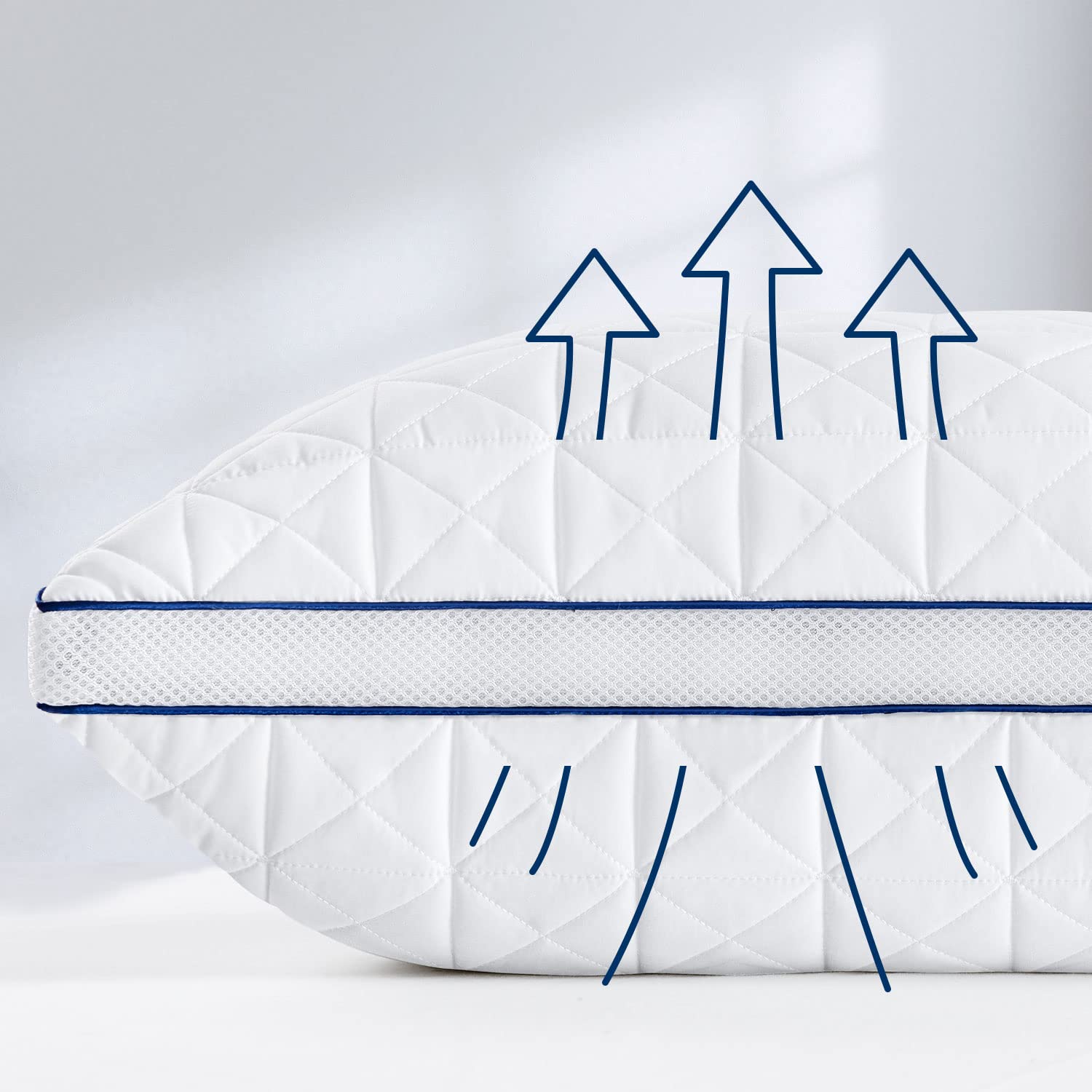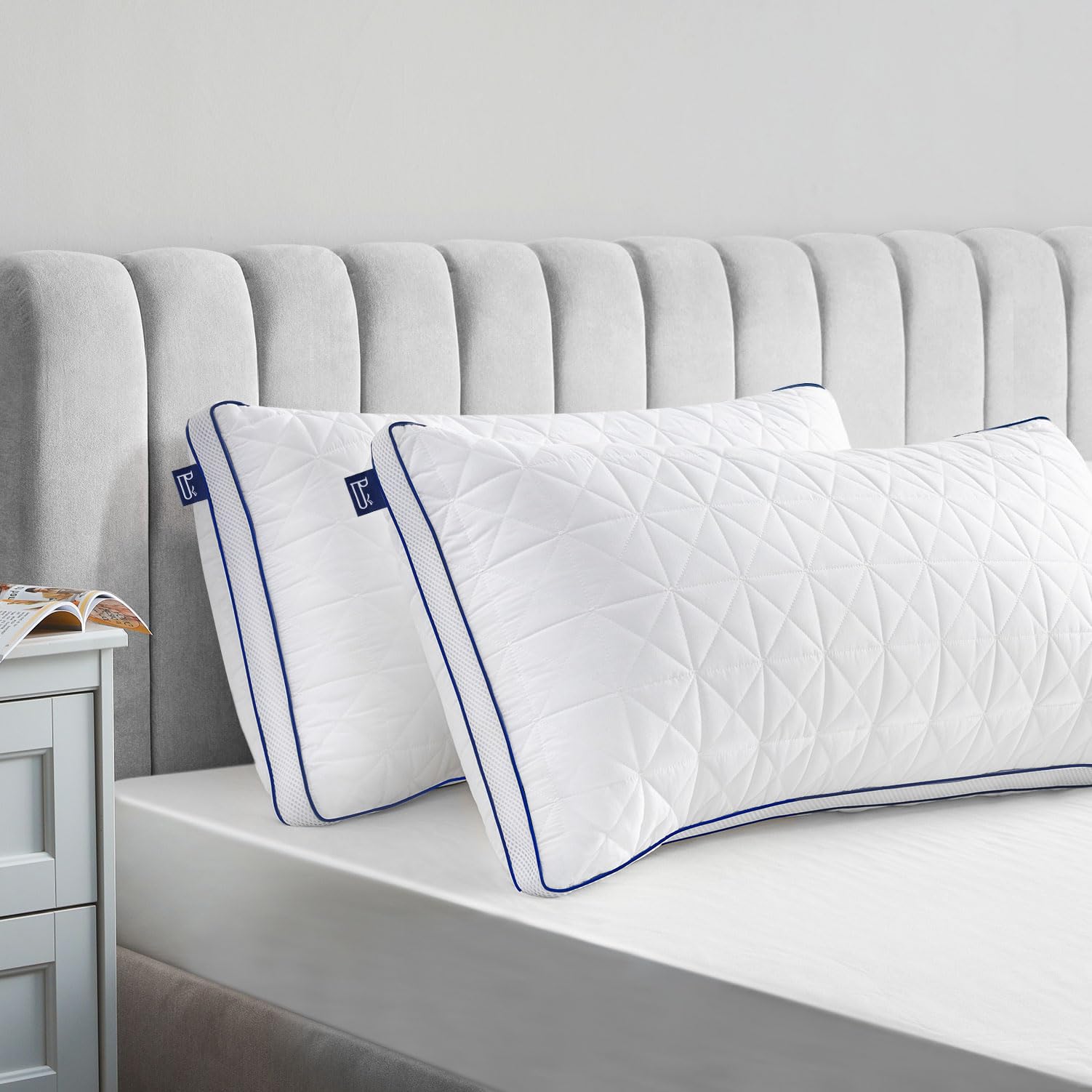 Das ästhetische Design mit dem dezenten Muster und den blauen Ziernähten verleiht Ihrem Schlafzimmer eine elegante Note. Die Kissen sind nicht nur als Schlafkissen ideal, sondern auch als bequeme Stütze auf dem Sofa oder als Kuschelkissen im Wohn- oder Kinderzimmer.