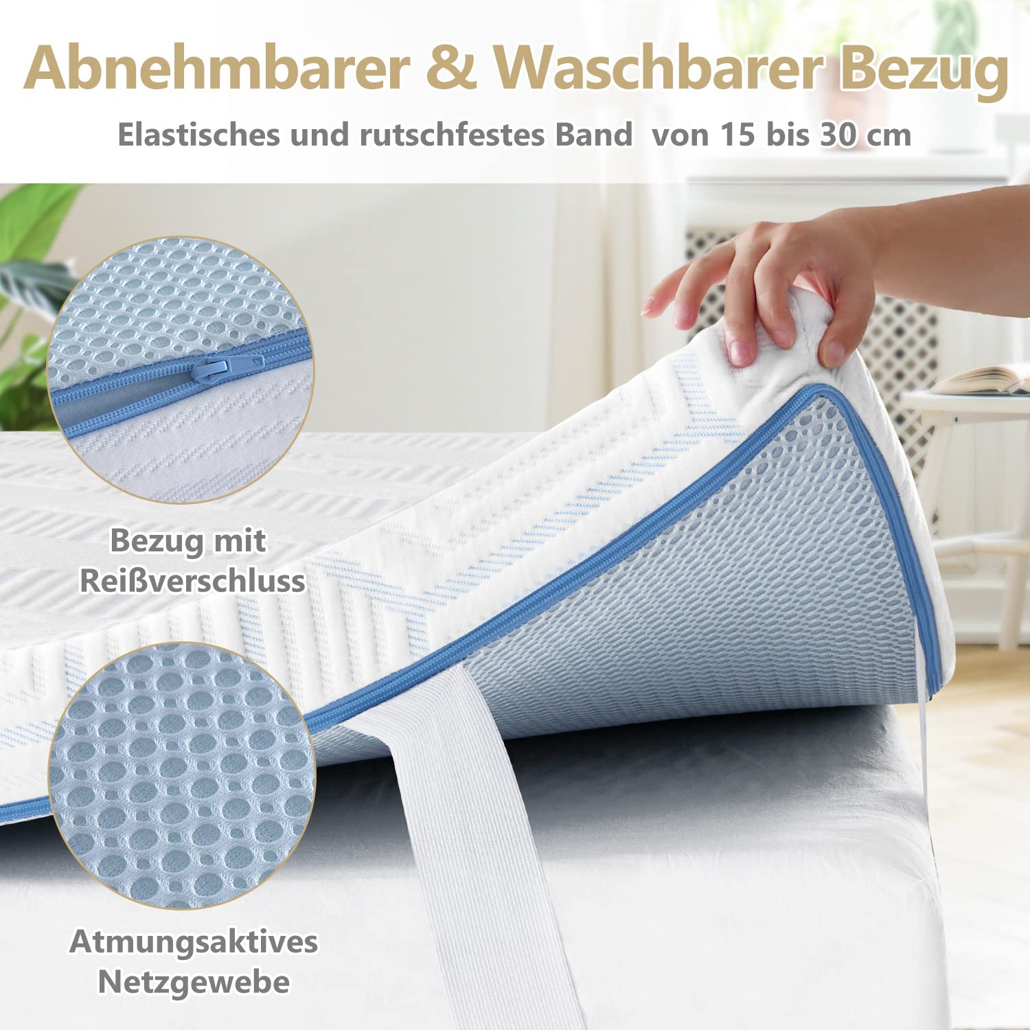 Der Topper ist wendbar und bietet zwei Härtegrade: eine weichere Seite (H2) aus Gel-Viscoschaum für ein sanftes Liegegefühl und eine festere Seite (H3) aus stützendem Kaltschaum. So können Sie je nach Vorliebe und Schlafposition die für Sie perfekte Seite wählen.