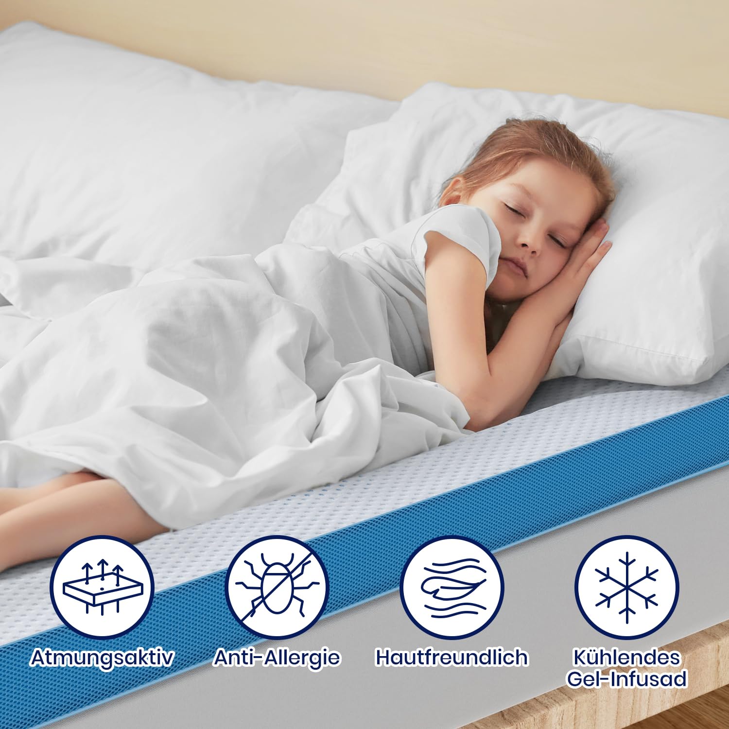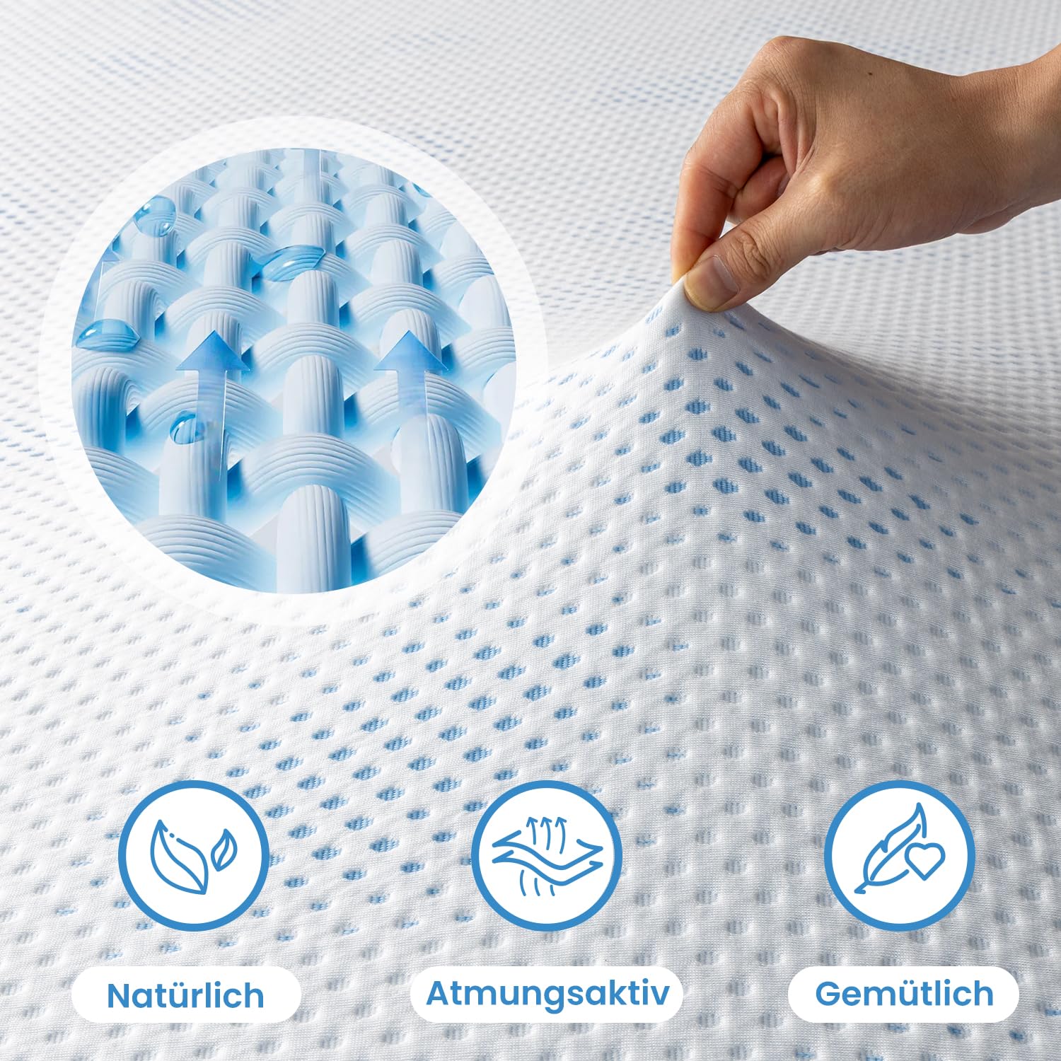 - Kühlender Gel-Schaum: Dank des perforierten Designs wird die Luftzirkulation aktiv gefördert. Dies sorgt für ein durchgehend angenehmes und kühles Schlafklima, ohne Hitzestau.