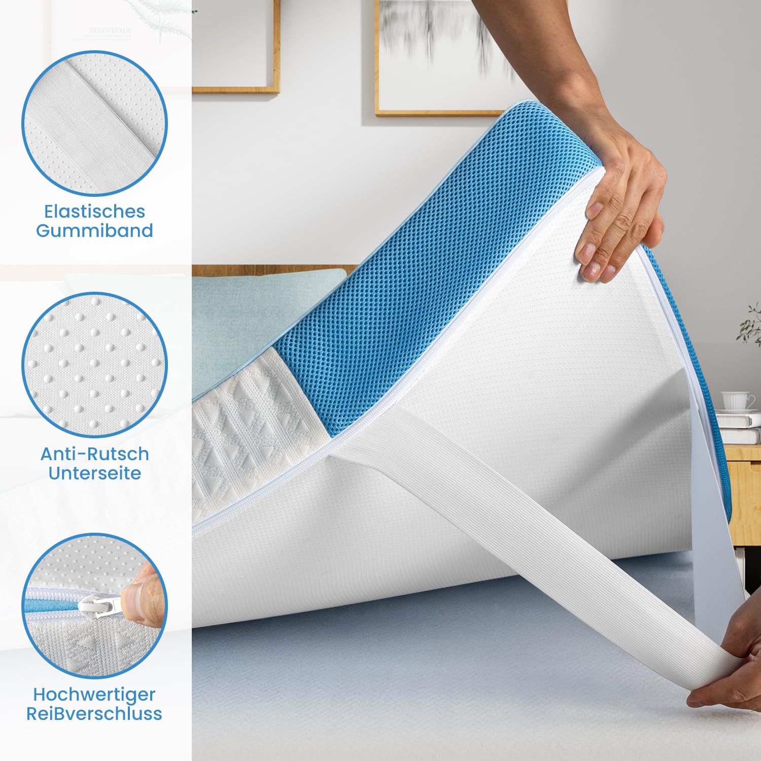 Absolut. Der Topper kombiniert kühlenden Gelschaum mit einem perforierten Design. Diese Struktur fördert aktiv die Luftzirkulation, leitet überschüssige Körperwärme ab und verhindert so Hitzestau und unangenehmes Schwitzen für ein durchgehend frisches Schlafklima.