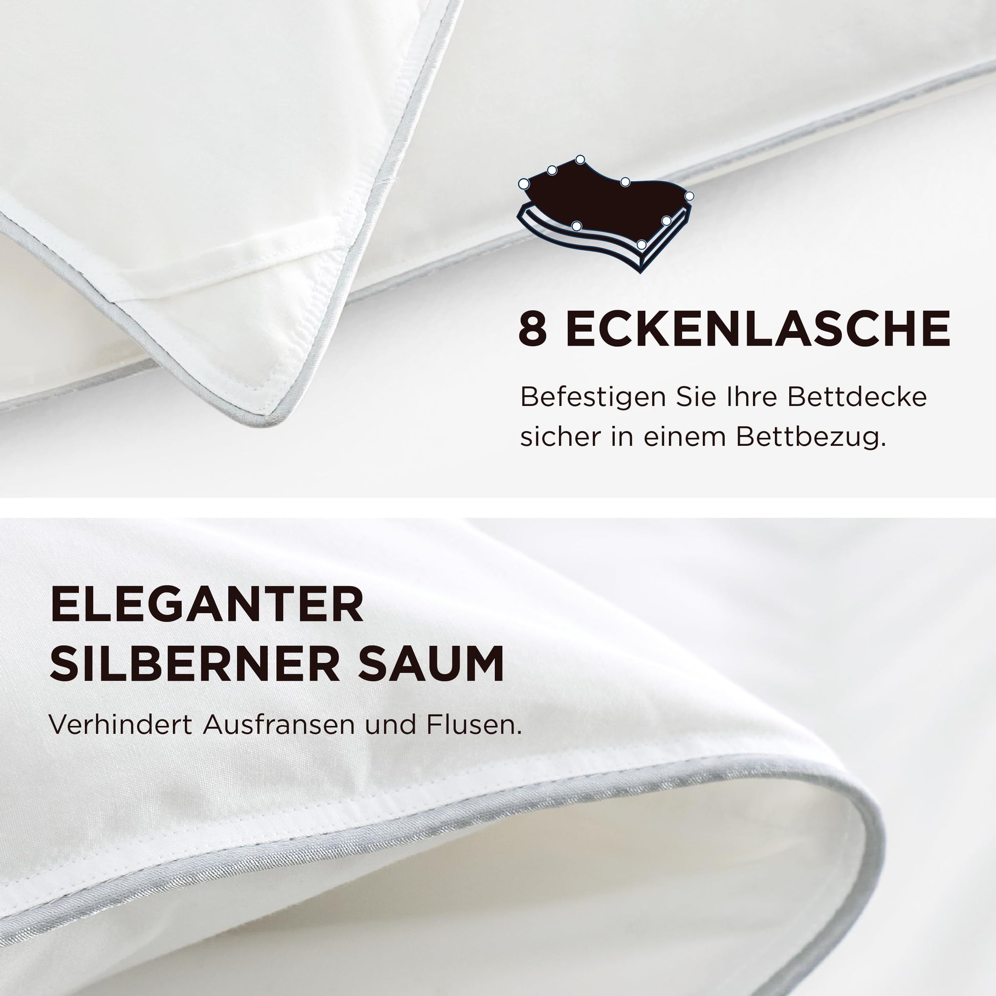 Dank der sorgfältigen Kassettensteppung bleibt die Füllung stets gleichmässig verteilt. So werden kalte Stellen und ein Verklumpen der Daunen auch nach langer Nutzung wirksam verhindert. Die Decke behält ihre Bauschkraft und Flauschigkeit dauerhaft bei. Verstärkte Doppelnähte und eine Paspelierung an den Rändern bürgen zudem für eine aussergewöhnliche Langlebigkeit.