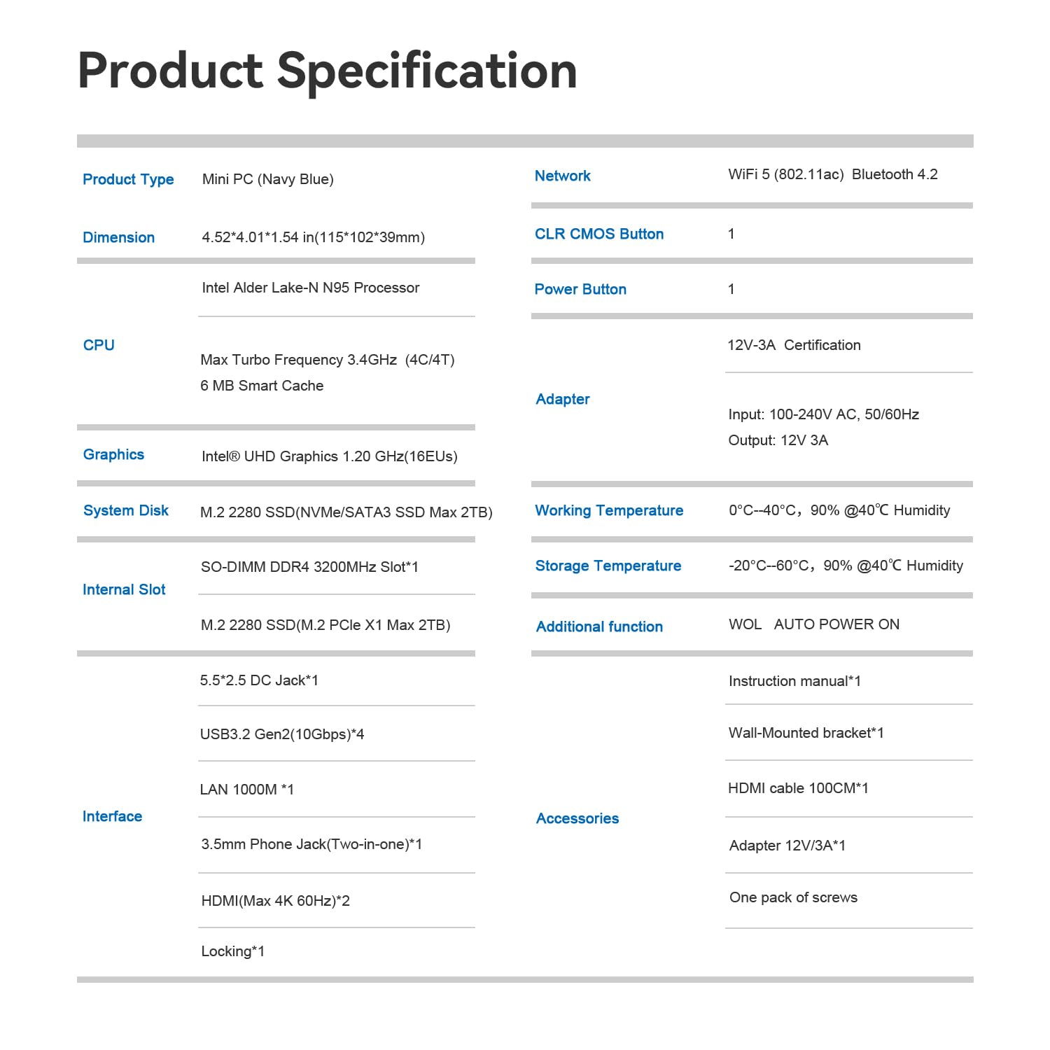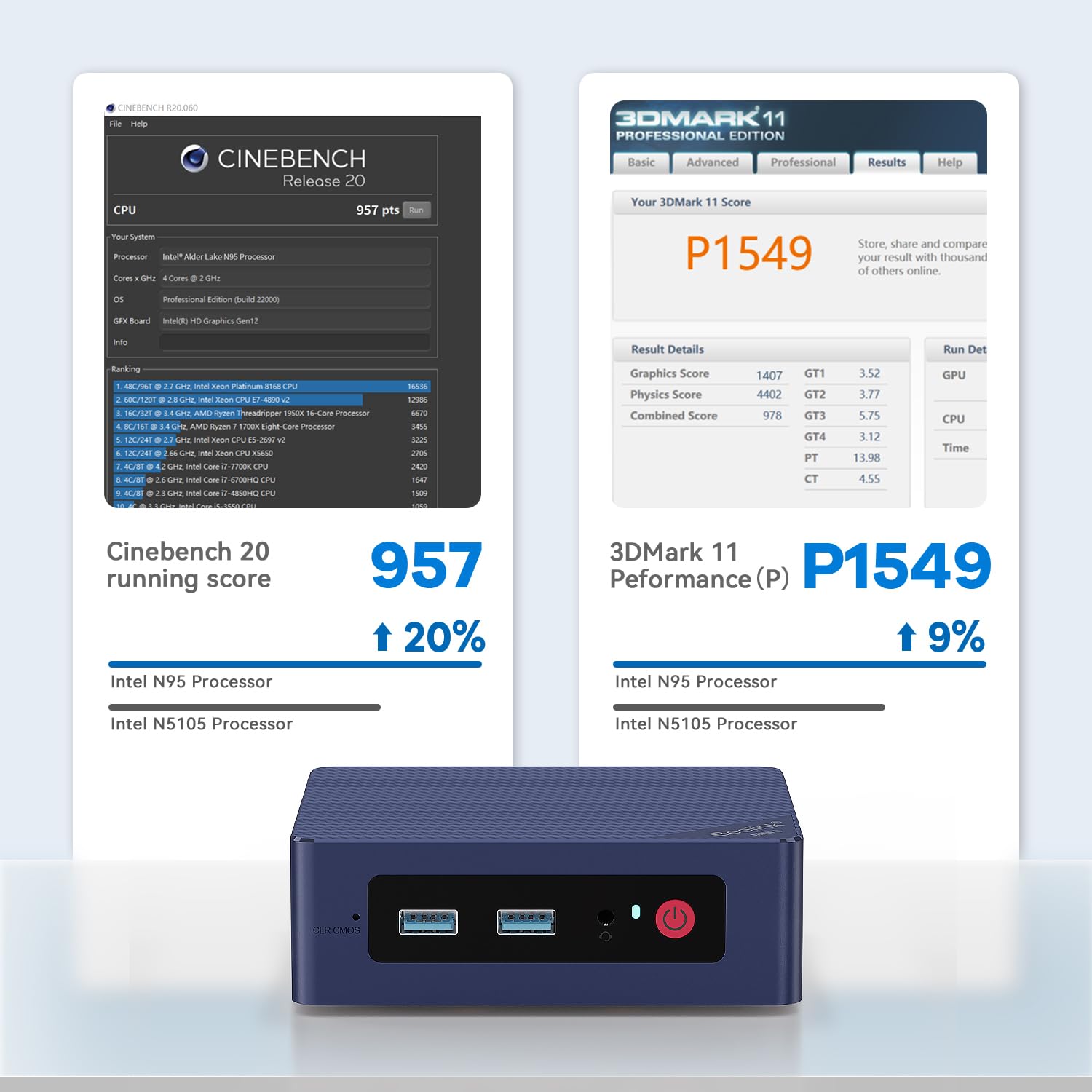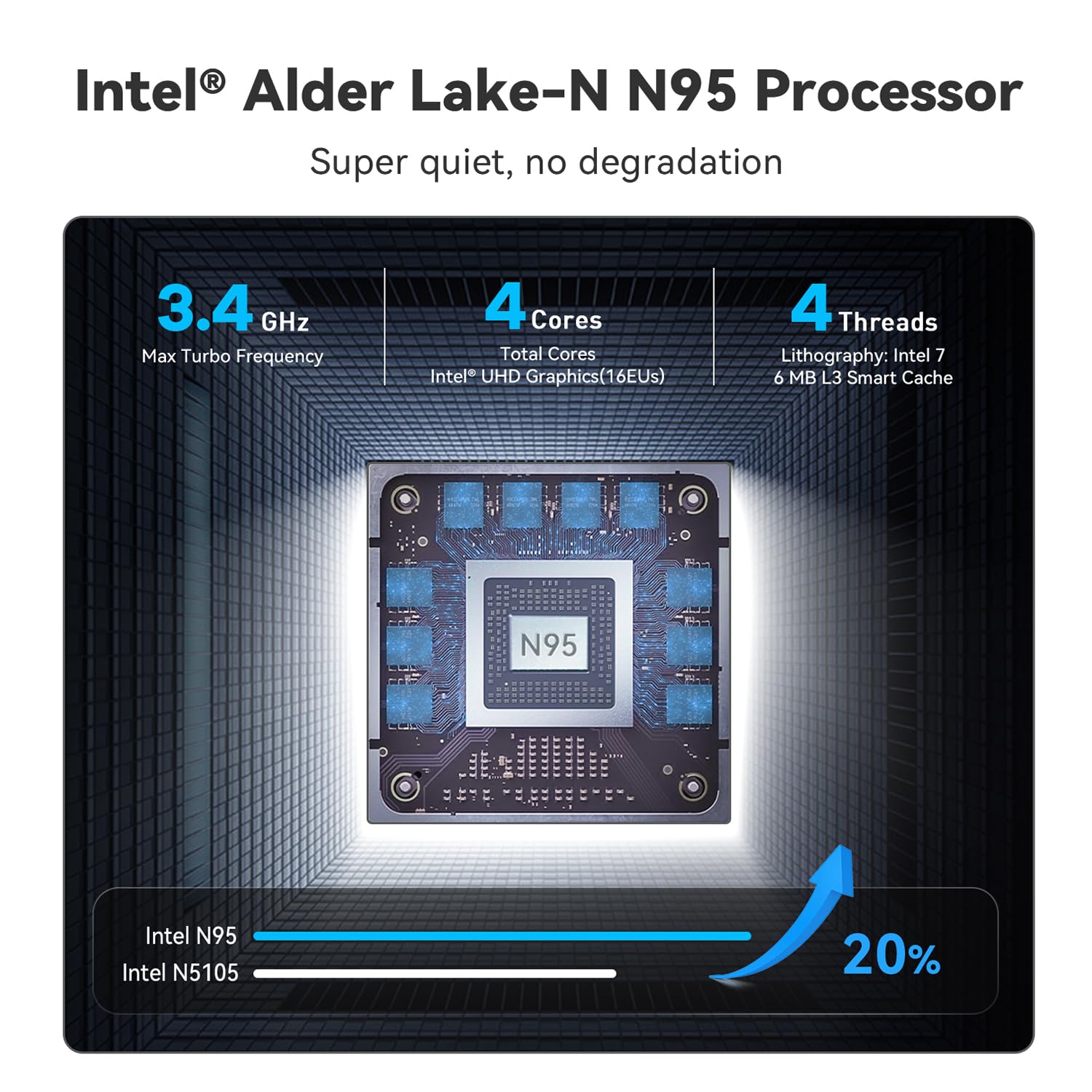 - Leistungsstarker Prozessor: Ausgestattet mit einem modernen Alder Lake-N N95 Prozessor (4 Kerne, 4 Threads) mit einer Turbofrequenz von bis zu 3,4 GHz, bietet dieser Mini-PC eine zuverlässige Performance für Ihre täglichen Aufgaben.