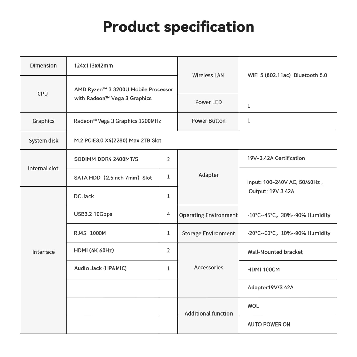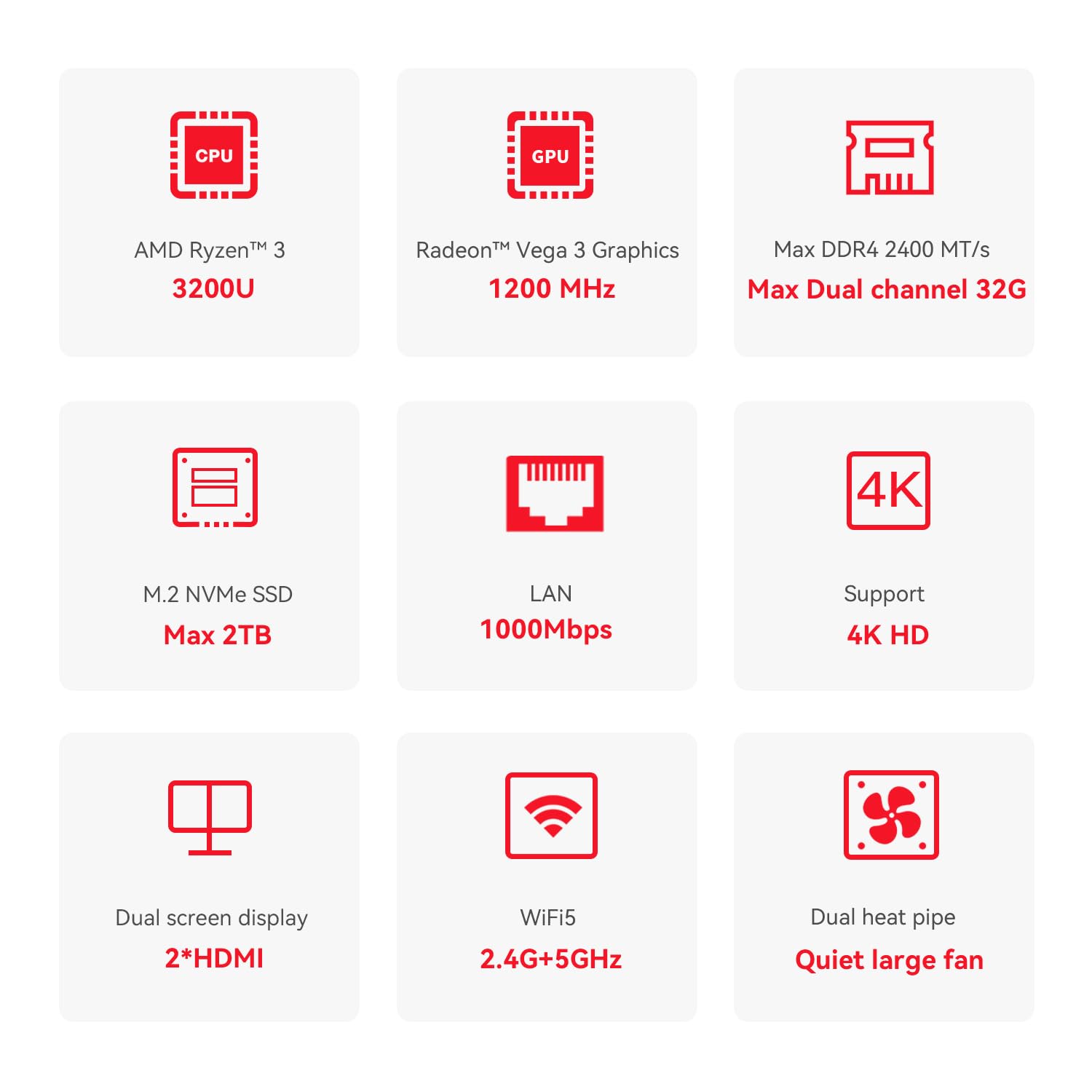 - Starker AMD Ryzen Prozessor: Angetrieben von einem AMD Ryzen 3 3200U Prozessor mit 2 Kernen, 4 Threads und einer Taktfrequenz von bis zu 3,5 GHz, bewältigt dieser PC mühelos alltägliche Aufgaben.