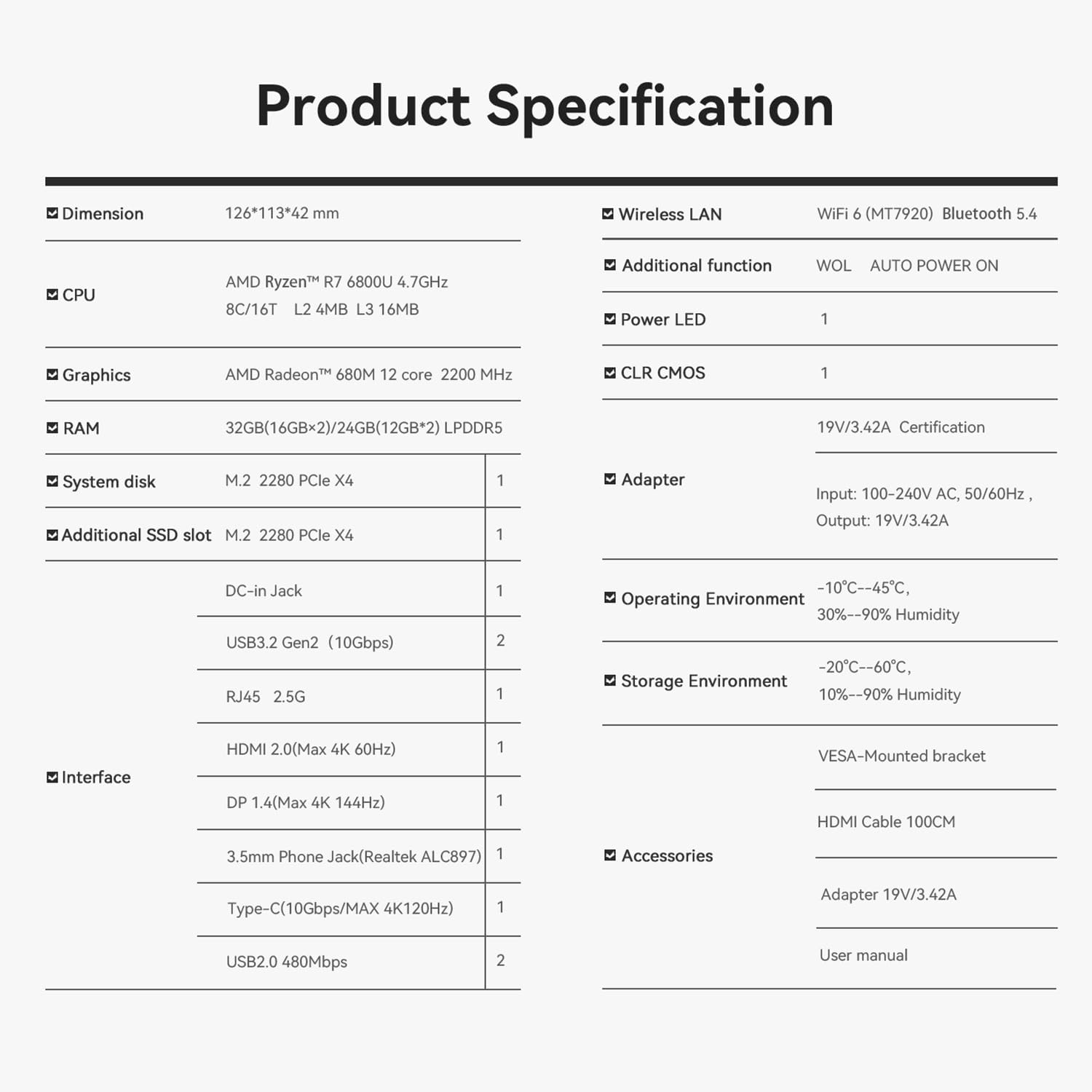 Ein fortschrittliches Kühlsystem mit Wärmerohr, Kühlkörper und einem leisen Lüfter (MSC2.0-Technologie) stellt auch unter Volllast eine optimale Systemstabilität und Wärmeabfuhr sicher. Der Mini-PC bietet eine umfassende Auswahl an Anschlüssen für maximale Flexibilität: 2x USB 3.2 Gen2 (10Gbps), 2x USB 2.0, 1x RJ45 2.5G LAN, 1x HDMI, 1x DisplayPort, 1x Typ-C und ein Kopfhöreranschluss.
