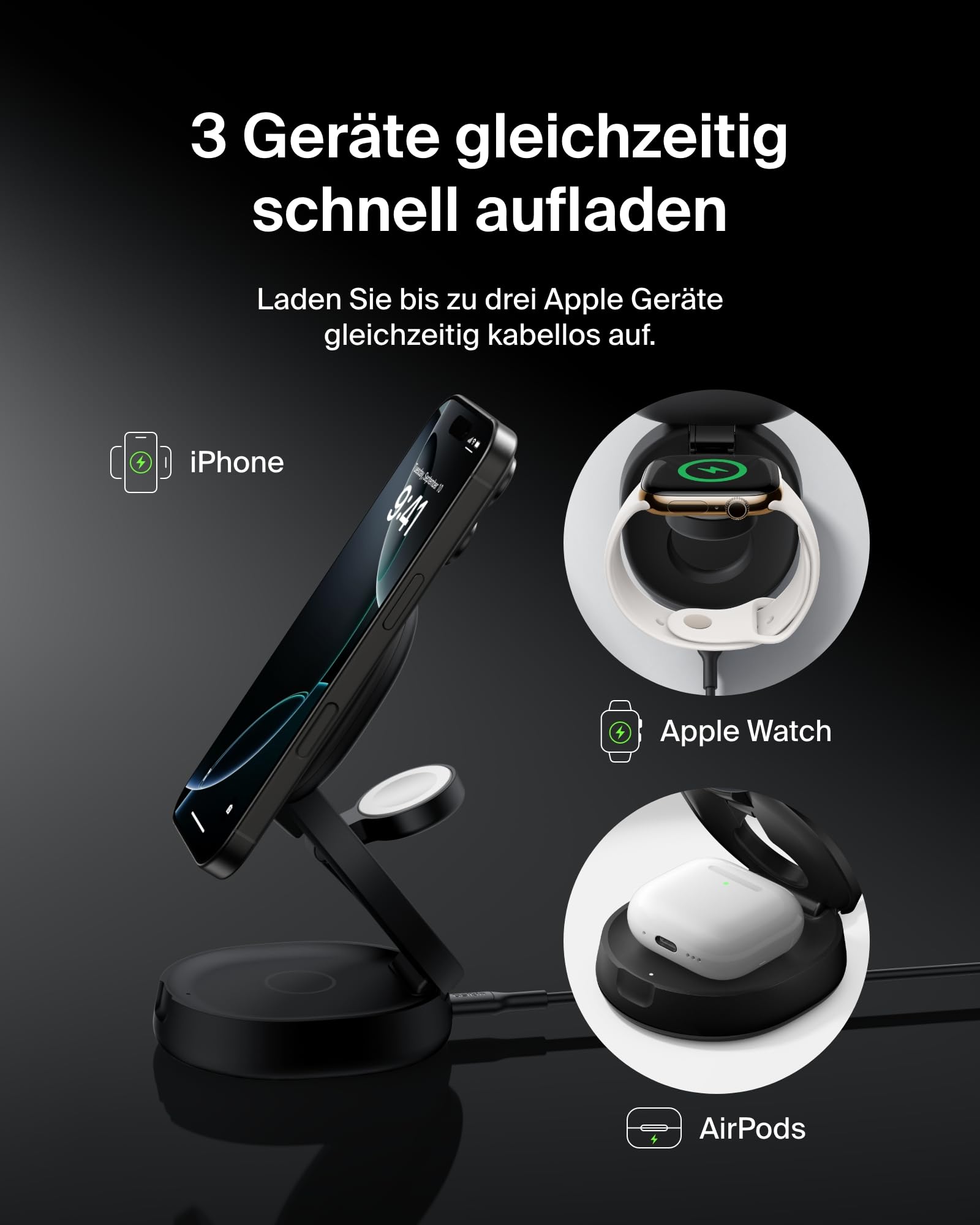 - 3-in-1 Ladefunktion: Lädt Ihr iPhone, Ihre Apple Watch und Ihre AirPods simultan auf.