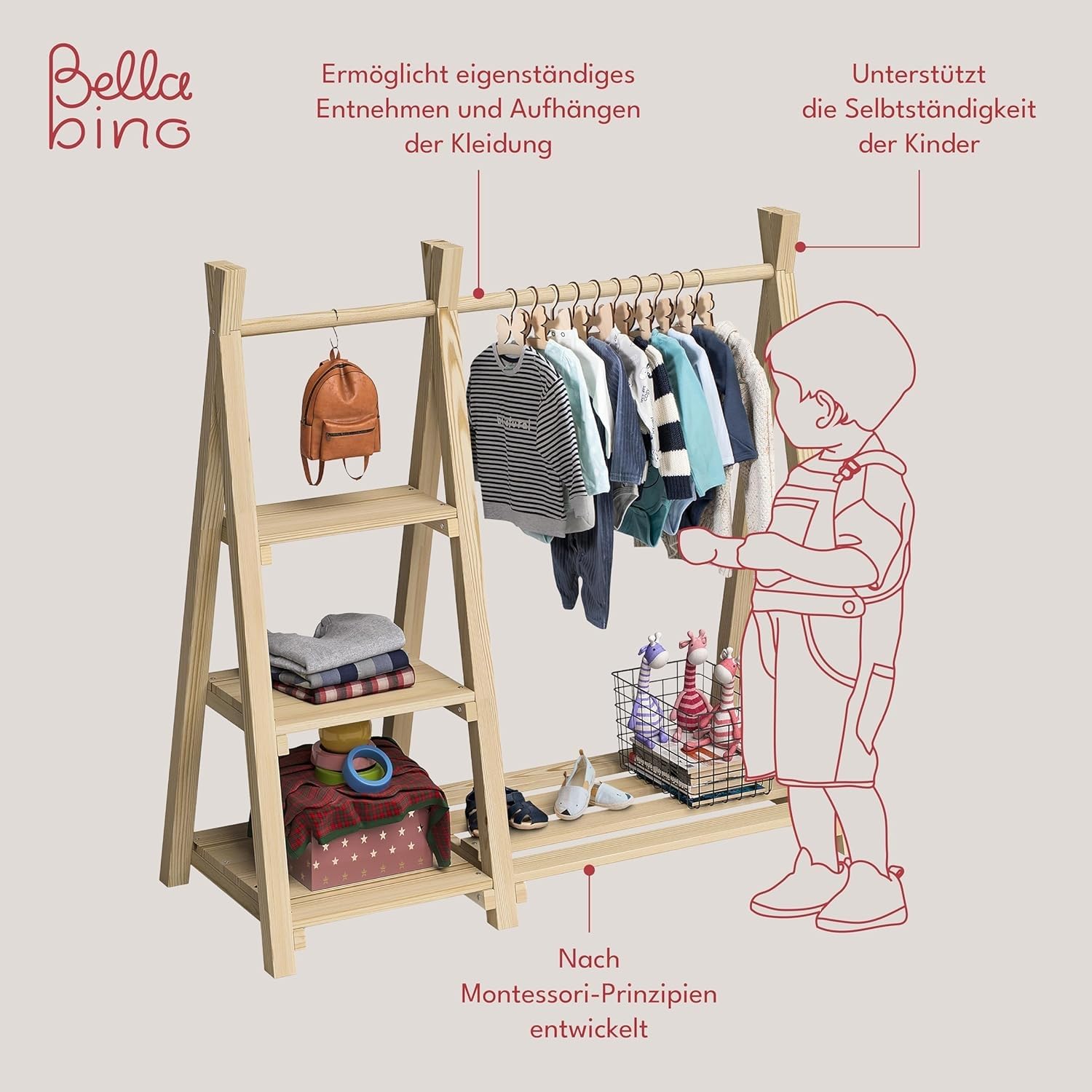 Die Bellabino Ryck Kleiderstange ist die ideale erste Garderobe, um im Kinderzimmer spielerisch Ordnung und Selbstständigkeit zu fördern. Sie kombiniert ein kinderfreundliches Design nach Montessori-Prinzipien mit der natürlichen Schönheit von massivem Holz.