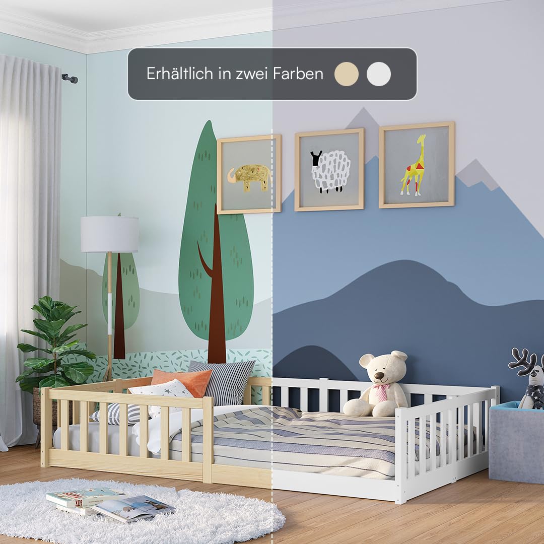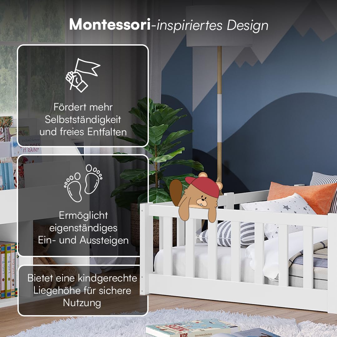 - Montessori-inspiriertes Design: Die niedrige, bodennahe Bauweise ermöglicht es Ihrem Kind, eigenständig und sicher ins Bett zu steigen und es wieder zu verlassen.