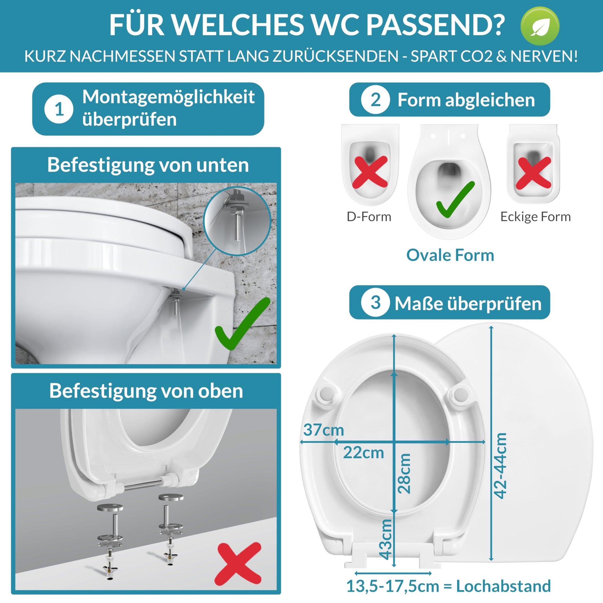 Der Sitz ist für die meisten handelsüblichen, ovalen Standard-Toiletten geeignet. Bitte vergleichen Sie vor dem Kauf die Masse Ihrer Keramik mit der Anleitung auf Bild 4. Die Montage erfolgt stabil und wackelfrei von der Unterseite und ist dank der Anleitung in nur fünf Schritten einfach durchzuführen.
