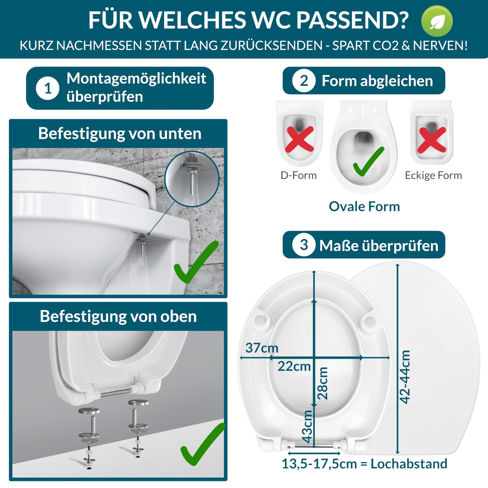 Der Sitz hat eine universelle Passform für die meisten handelsüblichen, ovalen Standard-Toiletten. Dank des cleveren Befestigungssystems kann er flexibel und einfach von oben oder unten montiert werden, was die Installation in nur wenigen Schritten ermöglicht.