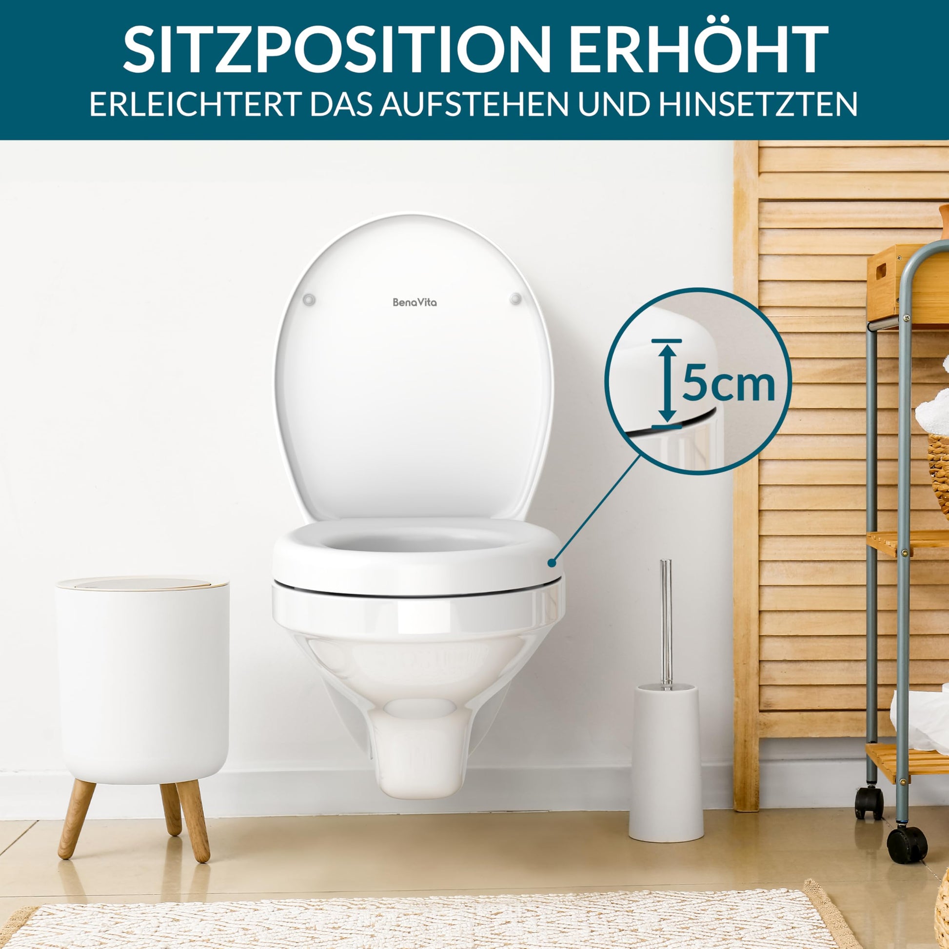 Die Erhöhung um 5 cm ist ideal für Senioren, Personen mit eingeschränkter Mobilität oder nach Operationen. Sie erleichtert das Hinsetzen und Aufstehen erheblich, schont die Gelenke und erhöht die Selbstständigkeit sowie die Sicherheit im Badezimmer.