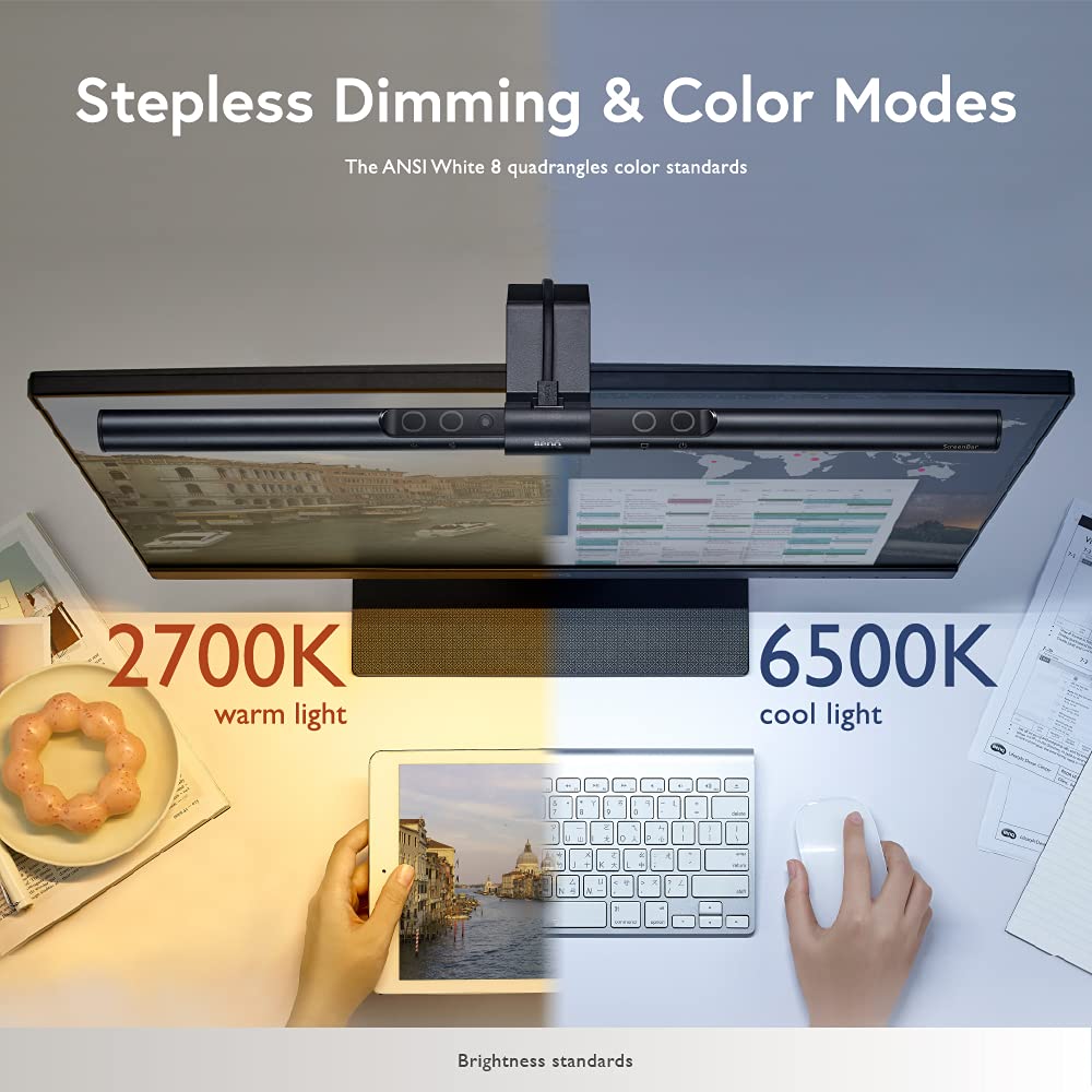 Nein, die ScreenBar bietet beides. Ein integrierter Umgebungslichtsensor kann die Helligkeit automatisch an die Umgebung anpassen und sorgt so für ideale Lichtverhältnisse. Sie können jedoch jederzeit über die intuitiven Touch-Bedienelemente die Helligkeit und die Farbtemperatur (2700K warmweiss bis 6500K kaltweiss) selbst regulieren.